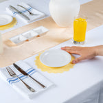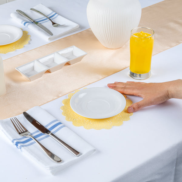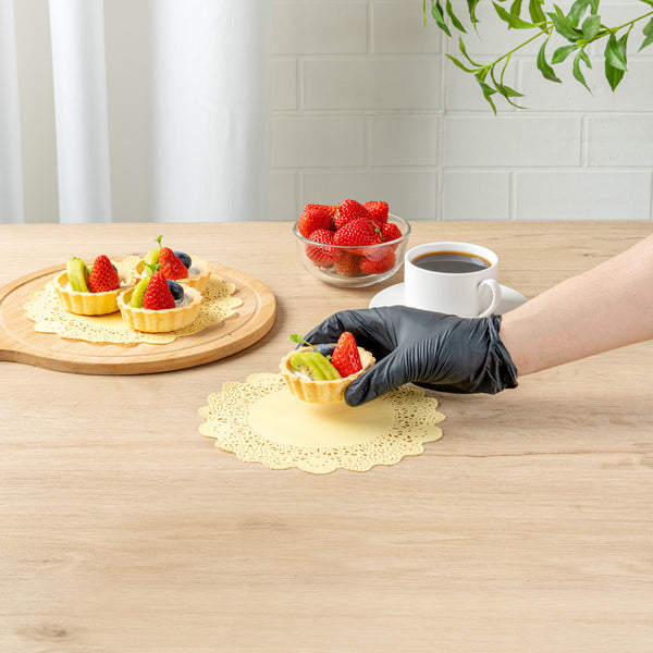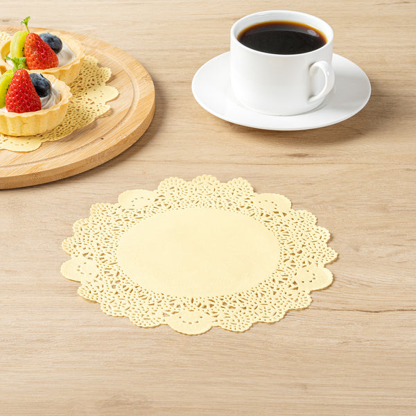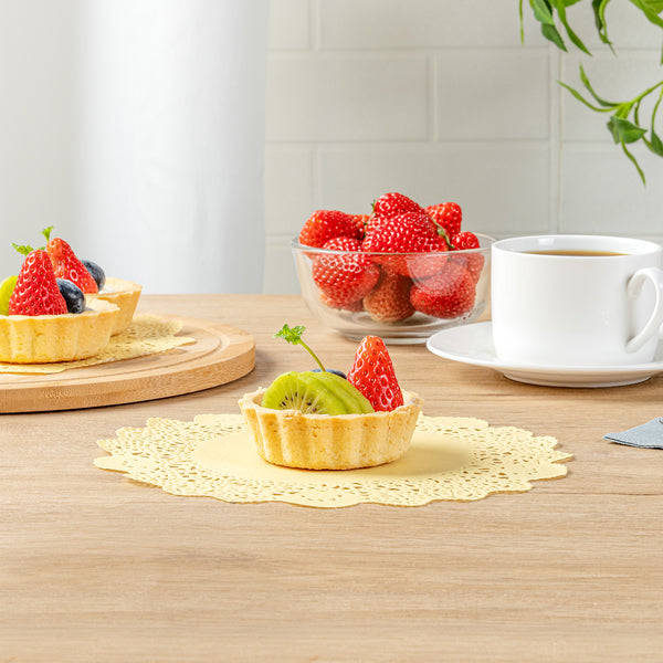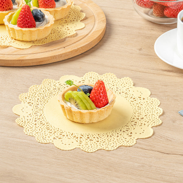 Enhance your dessert displays with our Pastry Tek Round Yellow Paper Doilies, adding an elegant touch to any presentation. Crafted from high-quality paper, these lace doilies provide exceptional durability while showcasing desserts at bakeries or catered luncheons without tearing or losing their structural integrity. The intricate lace-like details of these table doilies elevate the visual appeal of food presentations, serving as functional barriers that protect surfaces and absorb moisture. This yellow colored finish in these paper doilies seamlessly complements a wide range of table settings and themes, making it an ideal choice for various events and occasions. For busy hosts and food establishments, these disposable doilies eradicate the hassle of post-event cleanup, offering a convenient and time-saving solution. Perfect for use under cupcakes, petit fours, macarons, and other small treats, these small doilies are versatile and practical. Measuring 8 inches in diameter, these lace doilies are designed to fit perfectly with your dessert needs. Sold in a 100 count box.
