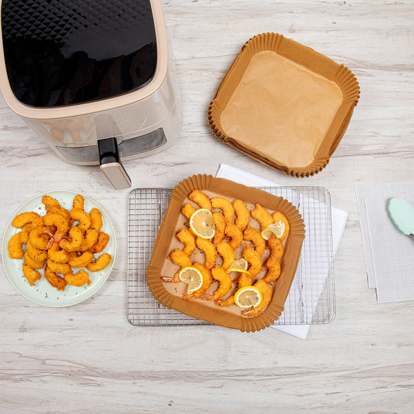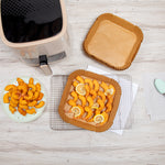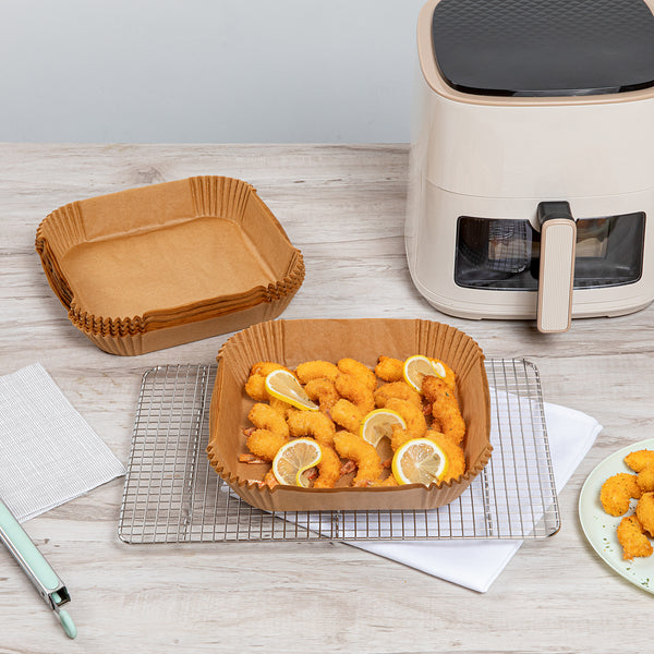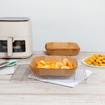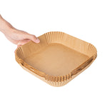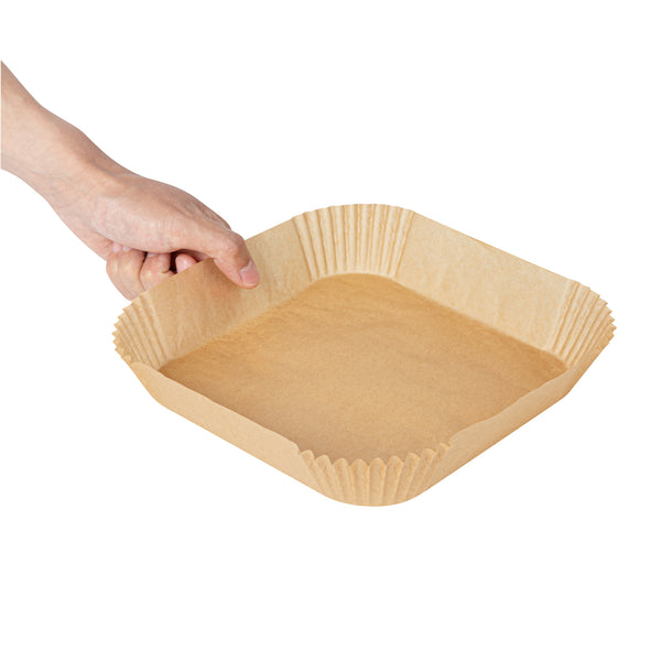 Transform your cooking experience with our Pastry Tek Square Unbleached Air Fryer Liners / Parchment Papers. The double-sided silicone coating of these air fryer liners prevents food from sticking, ensuring easy release and effortless cleanup. These air fryer paper liners are heat-resistant up to 445F and compatible with ovens, microwaves, instant pots, frying pans, and steamers. The greaseproof and waterproof design of these air fryer parchment papers prevent oils and liquids from soaking through, keeping your food intact and your air fryer clean. These air fryer inserts are crafted from thick food-grade paper and unbleached, ideal for cooking a variety of food items. Designed in a convenient square bowl shape, these air fryer basket liners fit seamlessly into your cookware without the need for cutting. These non-stick air fryer liners are freezer-safe and suitable for storing various foods in the refrigerator. Ideal for foodservice establishments looking to reduce their carbon footprint, these parchment papers for air fryers are recyclable. To facilitate an easy cleaning experience, these disposable paper liners can be discarded after use. Measuring 8 inches in length by 8 inches in width by 1.75 inches in height, these paper air fryer liners are perfectly sized for most air fryer baskets. Sold in a 100 count box.