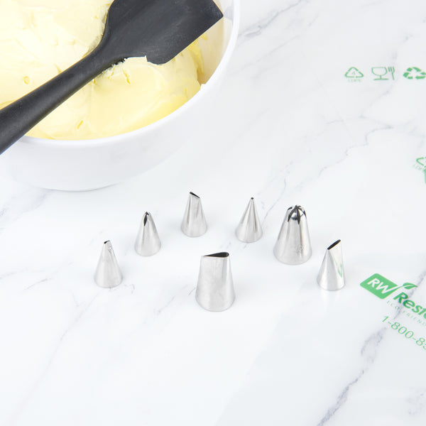 Create intricate frosting flowers with our Pastry Tek #125 Petal Piping Tip. Crafted from high-quality stainless steel, this durable icing tip is conveniently dishwasher-safe and reusable. Use this versatile cake piping tool to design dramatic ruffles on a bridal shower cake or add a beautiful frosting bow to birthday cupcakes at your bakery. With a teardrop shape tip, this rose cupcake tip creates gorgeous flower petals, bold ruffles, elegant drapes, swags, bows, and more. This icing bag tip measures 1 inch wide by 1.5 inches tall and ships in a 1 count box.