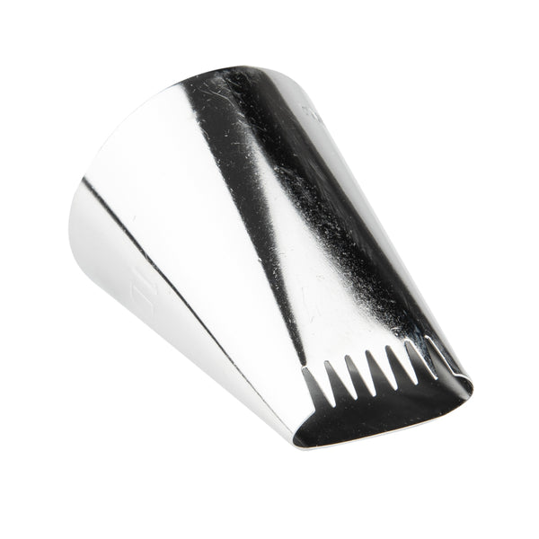Cover your cakes with textured basket weave-inspired patterns using this Pastry Tek Stainless Steel #1D Basketweave Piping Tip. Featuring a large oval-shaped opening with 6 sharp teeth on one side, this icing tip can produce dramatically ruffled borders, ridged stripes, wide zig-zags, and beautiful bow detailing. Use this #1D piping tip to create an eye-catching basket weave cake - or to add unique accents to cupcakes, cookies, brownies, and more. An excellent addition to your existing collection of piping bags and tips, this large basketweave decorating tip can be used with most standard-sized piping bags. Each of these dent-resistant stainless steel piping tips measures 1.2 inches wide by 1.5 inches tall. Sold in a 1 count box.