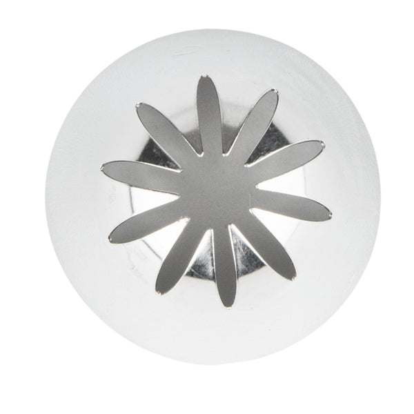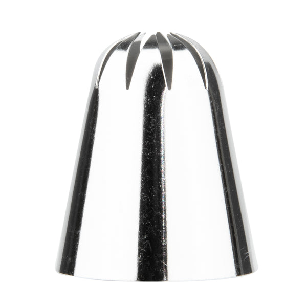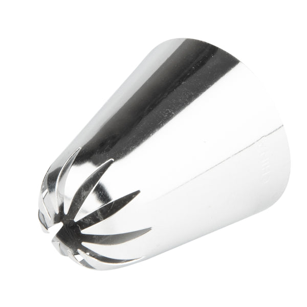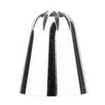 Add eye-catching details to cakes, cupcakes, cookies, and more with this Pastry Tek Stainless Steel #1G Drop Flower Piping Tip. Featuring a large 10-pointed drop flower design, this cupcake icing tip produces beautiful flowers, bold borders, enticing swirls, and more! Use this specialty frosting decorating tip to cover entire cakes with intricate rosettes - or to pipe large floral accents onto your bakery's best-selling treats. Made from high-quality stainless steel, this dent-resistant cake decorating tip is designed to withstand long-term use in commercial kitchens and bakeries. This large piping tip measures 1.1 inches wide by 1.4 inches tall. Shipped in a 1 count box.