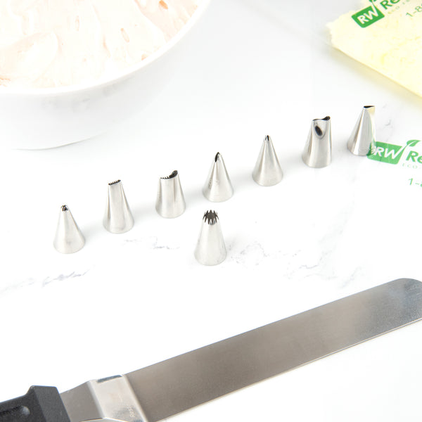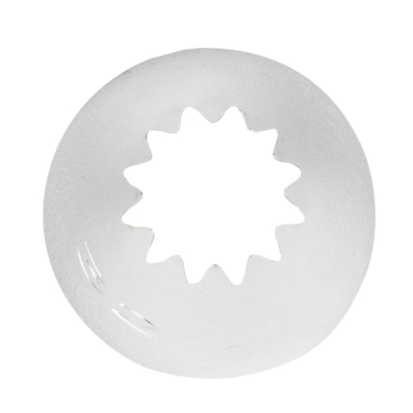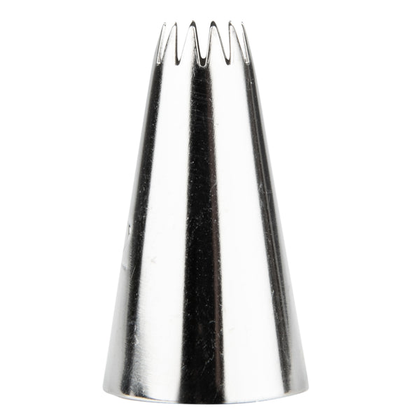 Cover cakes with spectacular decorations and beautiful designs using this Pastry Tek Stainless Steel #32 Open Star Piping Tip. Featuring a round-shaped design with many finely cut teeth, this pastry bag tip is ideal for topping a cake with dramatically textured rosettes or adding stunning swirls of frosting to a batch of cupcakes. Use this piping tip with royal icing or buttercream frosting to create deeply ridged swirls, enticing swag borders, shell details, and more! Made from high-quality stainless steel, this frosting piping tip is conveniently dent-resistant and designed to withstand commercial use. Each of these icing tips measures 0.7 inches in width by 1.2 inches in height and fits most standard-sized icing bags and couplers. Sold in a 1 count box.