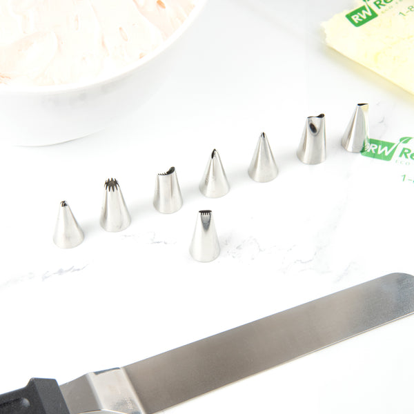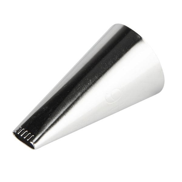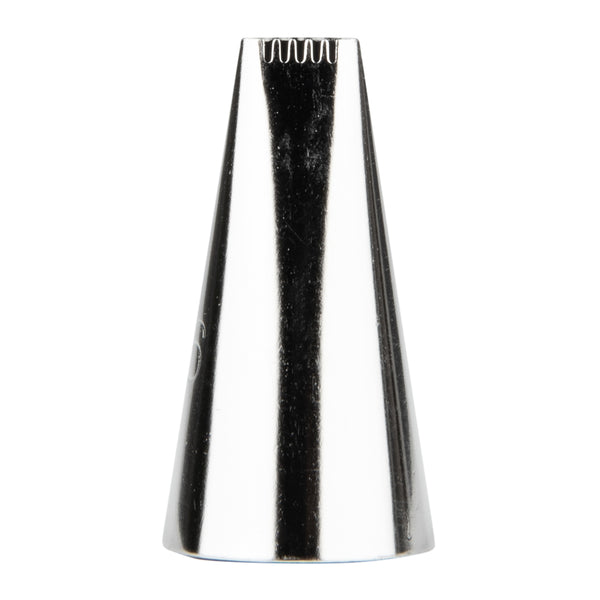 Create all types of mesmerizing patterns and decorations with this Pastry Tek Stainless Steel #46 Basketweave Piping Tip. Equipped with one serrated edge and one smooth edge, this oval-shaped piping tip can be used to add smooth or ribbed stripes to your baked goods. Use this piping tip to decorate a beautiful basket weave cake - or to pipe decorative edges, plain borders, ridged stripes, silky swirls, and more! Ideal for bakeries, cake shops, and catering companies, this stainless steel piping tip is impressively durable and dent-resistant. Designed to fit most standard-sized frosting bags and couplers, this cake decorating tip measures 0.7 inches wide by 1.2 inches tall. Shipped in a 1 count box.