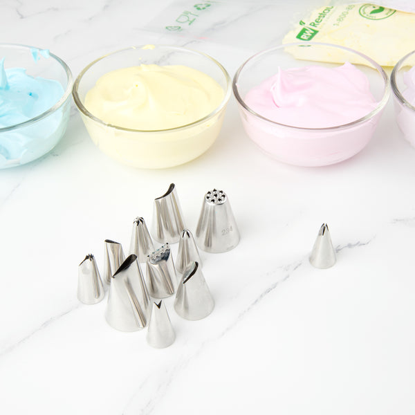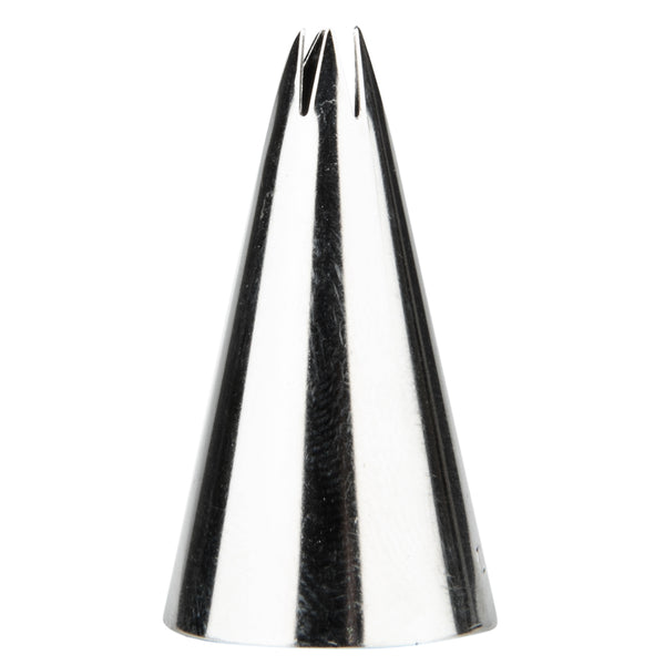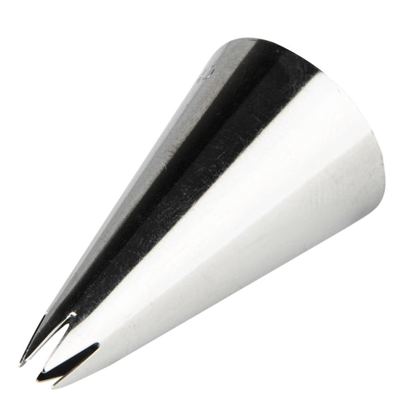 Your rosette-topped cupcakes and buttercream drop flowers wouldn't be complete without this Pastry Tek Stainless Steel #74 Leaf Piping Tip. Featuring a 5-pointed leaf opening, this icing bag tip creates deeply ridged leaves and intricately detailed shells with ease. Use this frosting decorating tip to create one-squeeze leaves, ribbed stripes, dramatic borders, textured drapes, and more! Suitable for use with most standard-sized piping bags and couplers, this leaf piping tip measures 0.7 inches in width by 1.2 inches in height. Each of these professional-quality piping tips is constructed from high-quality stainless steel and designed to withstand commercial use in busy bakeries and kitchens. Shipped in a 1 count box.