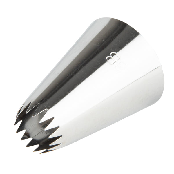 Add beautiful gems and wonderfully textured borders to your baked goods with our Pastry Tek Stainless Steel #8B Open Star Piping Tip. Featuring a large round shape with slender pointed teeth, this piping bag nozzle creates decorations with many ridges and details. Use these #8B icing tips to create mesmerizing stripes, shells, rosettes, dots, and stars of buttercream frosting to adorn your bakery's best-selling treats. Crafted from high-quality stainless steel, this pastry bag tip is designed to withstand long-term use in commercial kitchens and bakeries. This extra large piping tip measures 1.3 inches in width and 1.7 inches in length. Shipped in a 1 count box.