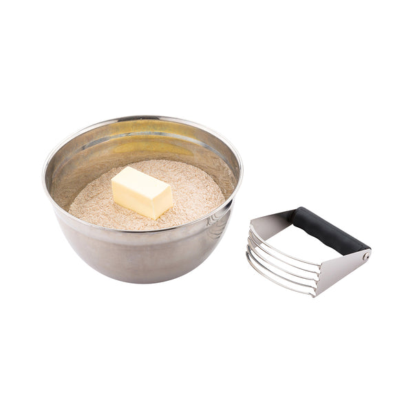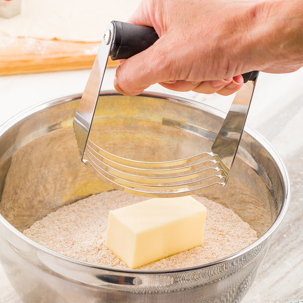 Expertly incorporate wet and dry ingredients with our Pastry Tek Stainless Steel Pastry Cutter And Dough Blender. The durable stainless steel on this dough blender prevents rust and is built to be long-lasting. This pastry dough cutter has 5 curved blades that cut through butter, lard, and shortening. The sturdy black plastic handle of this stainless steel pastry cutter is non-slip to provide a strong grip when handling. Great for easily creating flaky and soft crusts, mashed potatoes, or slice through vegetables with ease. Stick it in the dishwasher after use for a quick and easy clean up. This pastry cutter measures 4.75 inches in length and is 4 inches wide. Available in a 1 count box.
