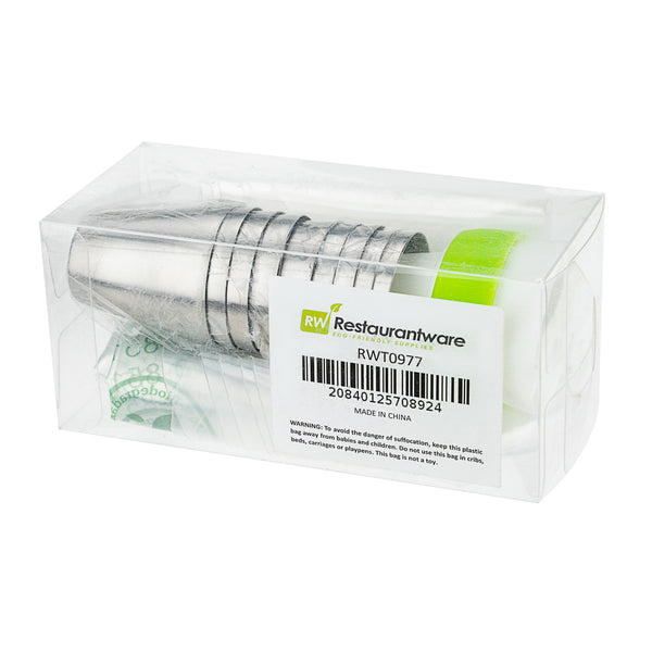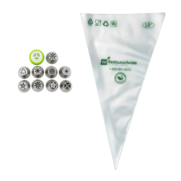 Frost all kinds of cakes and pastries using our Pastry Tek Stainless Steel Russian Piping Tip Decorating Set. This 20-piece frosting tip set features 9 Russian piping tips, 10 high-quality piping bags, and 1 tri-color coupler, all packaged in a clear plastic box to easily keep your decorating essentials stored in one place. Great for producing a variety of flowers and intricate designs, this piping nozzle set includes several Russian piping tip designs. To frost multiple colors at once, our tri-color coupler effortlessly creates swirls and borders onto cakes. Pipe frosting onto cupcakes with our biodegradable piping bags, to dispose of decorating tools in an eco-friendly way. Each piping tip in this cake decorating tip set measures 1.5 inches in diameter and 1.75 inches in height. Each piping bag measures 18 inches in length by 8.6 inches in width. The tri-color coupler measures 1.8 inches in diameter. The plastic box measures 5.1 inches in length by 2.3 inches in height. Shipped in a 1 count box. This item will only degrade outside of the traditional solid waste stream.