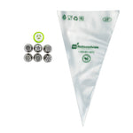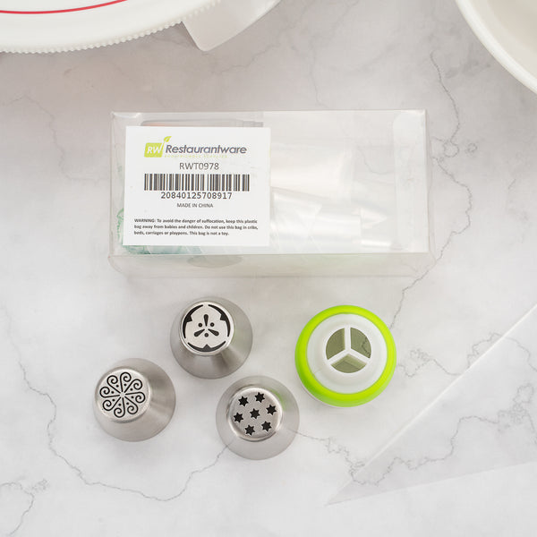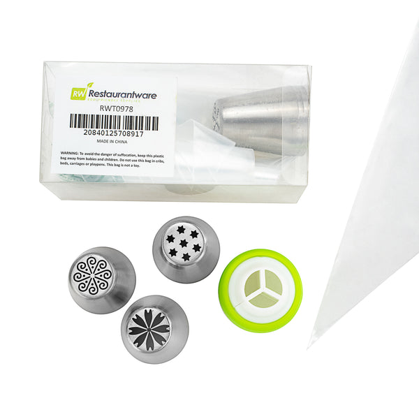 Grab all the decorating essentials needed to frost desserts using our Pastry Tek Stainless Steel Russian Piping Tip Set. Featuring 17 pieces, this piping tip set includes 6 Russian stainless steel piping tips, 10 piping bags, and 1 tri-color coupler, all packaged in a clear plastic box to keep your tools organized. This Russian piping tip set features several unique Russian tip designs to create intricate flowers, snowflakes and borders on cakes. The biodegradable piping bags in this flower piping tip set are ideal for an eco-friendly cleanup and offer a slip-resistant grip while frosting. To quickly switch between piping tips while decorating, the tri-color coupler in this piping tip set is perfect for frosting sweets in a simple motion. Each piping tip in this flower piping tip set measures 1.5 inches in diameter and 1.75 inches in height. Each piping bag measures 18 inches in length by 8.6 inches in width. The tri-color coupler measures 1.8 inches in diameter. The plastic box measures 5.1 inches in length by 2.3 inches in height. Sold in a 1 count box. This item will only degrade outside of the traditional solid waste stream.