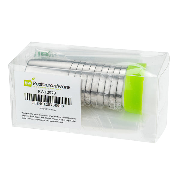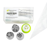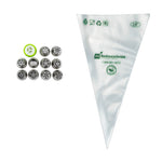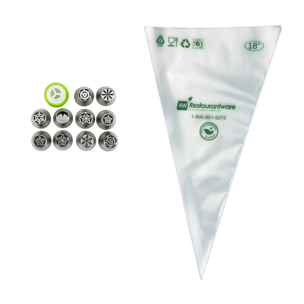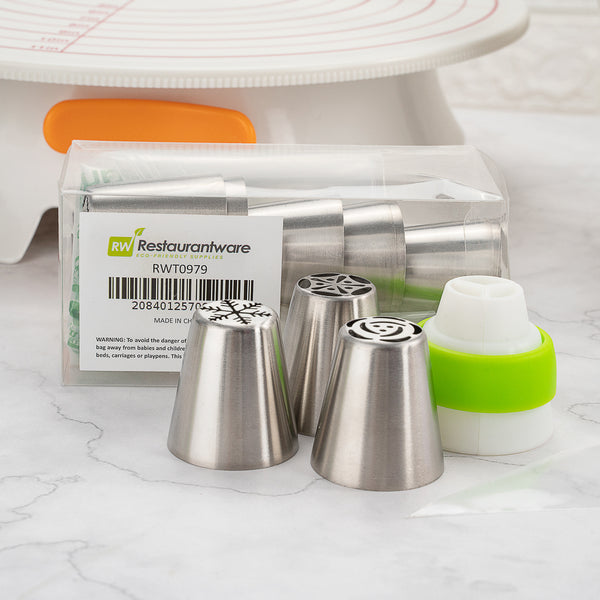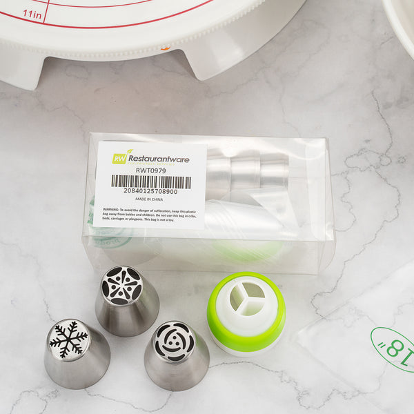 Frost cakes and desserts using our Pastry Tek Stainless Steel Russian Piping Tip Set. This icing tip includes 10 Russian piping tips, 10 piping bags, and 1 tri-color coupler, all packaged inside a clear plastic box to keep all your cake decorating tools organized and ready for use. Featuring unique Russian tip designs, this piping tip set for cakes is ideal for frosting flowers, petals, and detailed borders on treats. Pair these Russian piping tips with our included biodegradable piping bags, which keep their shape when full of frosting and are eco-friendly for an easy cleanup. The tri-color coupler includes interlocking pieces to create flawless multi-colored swirls and designs on desserts. Each piping tip in this piping tip set for cakes measures 1.5 inches in diameter and 1.75 inches in height. Each piping bag measures 18 inches in length by 8.6 inches in width. The tri-color coupler measures 1.8 inches in diameter. The plastic box measures 5.1 inches in length by 2.3 inches in height. Shipped in a 1 count box. This item will only degrade outside of the traditional solid waste stream.