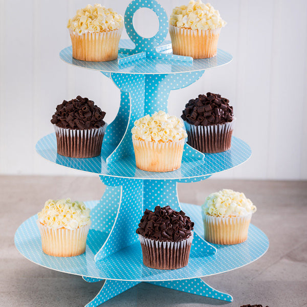 Create an irresistibly fun dessert display with this Pastry Tek Turquoise Cardboard Cupcake Stand! Featuring a sturdy design and 3 circular tiers, this round cupcake stand is ideal for displaying and serving all types of different desserts. The white and turquoise polka-dotted finish adds a playful pop of color to any setting, while the 3-layer design expertly elevates your dessert presentations. Manufactured from durable cardboard, this 3-tier cupcake stand is built to easily hold the weight of heavy desserts or finger foods. This cardboard cupcake tower is shipped flat and unassembled for easy, space-saving storage. When you're ready to use it, simply slide together the stylish tower pieces and the circular tiers. The smallest tier is 6.5 inches in diameter, the medium-sized tier is 9.5 inches in diameter, and the largest tier is 13.5 inches in diameter. This turquoise cupcake stand measures 14 inches in height and is sold in a 1 count box.