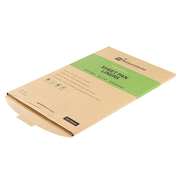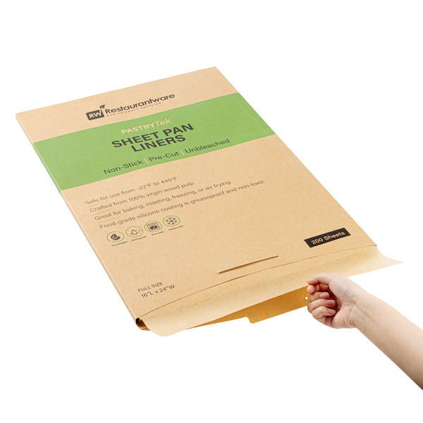 Use fewer supplies in your kitchen while cooking meals with our Pastry Tek Unbleached Paper Full Size Sheet Pan Liners. These full-size, pre-cut baking sheet liners are built with a double-sided silicone coating to avoid ingredients or unwanted oils from sticking onto your pan. To effortlessly bake, fry, or roast your food, these non-stick cookie sheet liners are temperature resistant up to 445F. These greaseproof silicone-lined baking sheet liners are waterproof and odorless to protect your ingredients from being stripped of their flavors. The unbleached high-fiber density paper construction in these silicone cookie sheet liners is created for long-lasting use. These reusable cookie sheet liners are made with wood pulp and are commercially compostable. These sheet pan liners measure 16 inches long by 24 inches wide. Sold in a 200 count box.