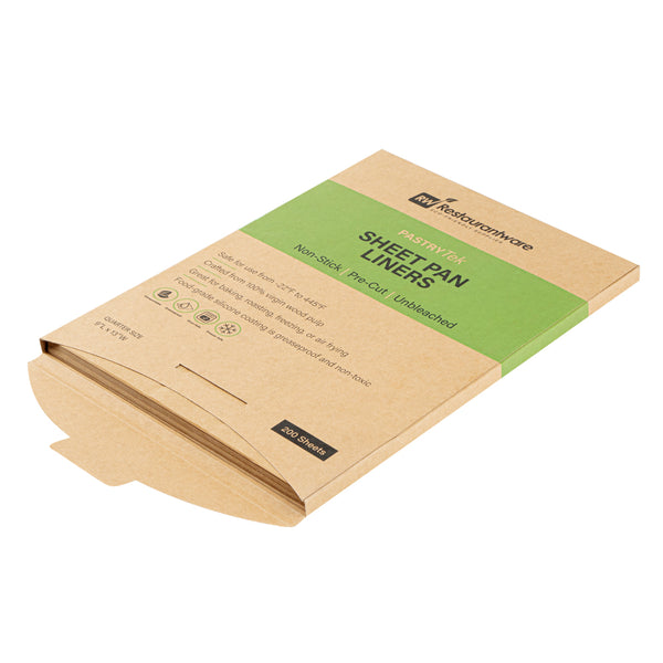 Effortlessly protect your goods with our Pastry Tek Unbleached Paper Quarter Size Sheet Pan Liners. These quarter-size baking sheet liners are pre-cut and fabricated with a double-sided silicone coating to ensure durability for withstanding temperatures up to 445F. With a greaseproof and waterproof design, these silicone cookie sheet liners help reduce undesired moisture from spreading on your treats. To simplify your cleaning process, these baking sheet liners are non-stick, reusable, and commercially compostable. Great for baking, frying, and grilling, these reusable cookie sheet liners are suitable to change your cooking style for any dish. These silicone-lined baking sheet liners are designed with an odorless high-fiber density paper made from virgin wood pulp to conveniently secure your food from contamination. These cookie sheet liners are unbleached and measure 9 inches tall by 12 inches wide. Sold in a 1000 count box.