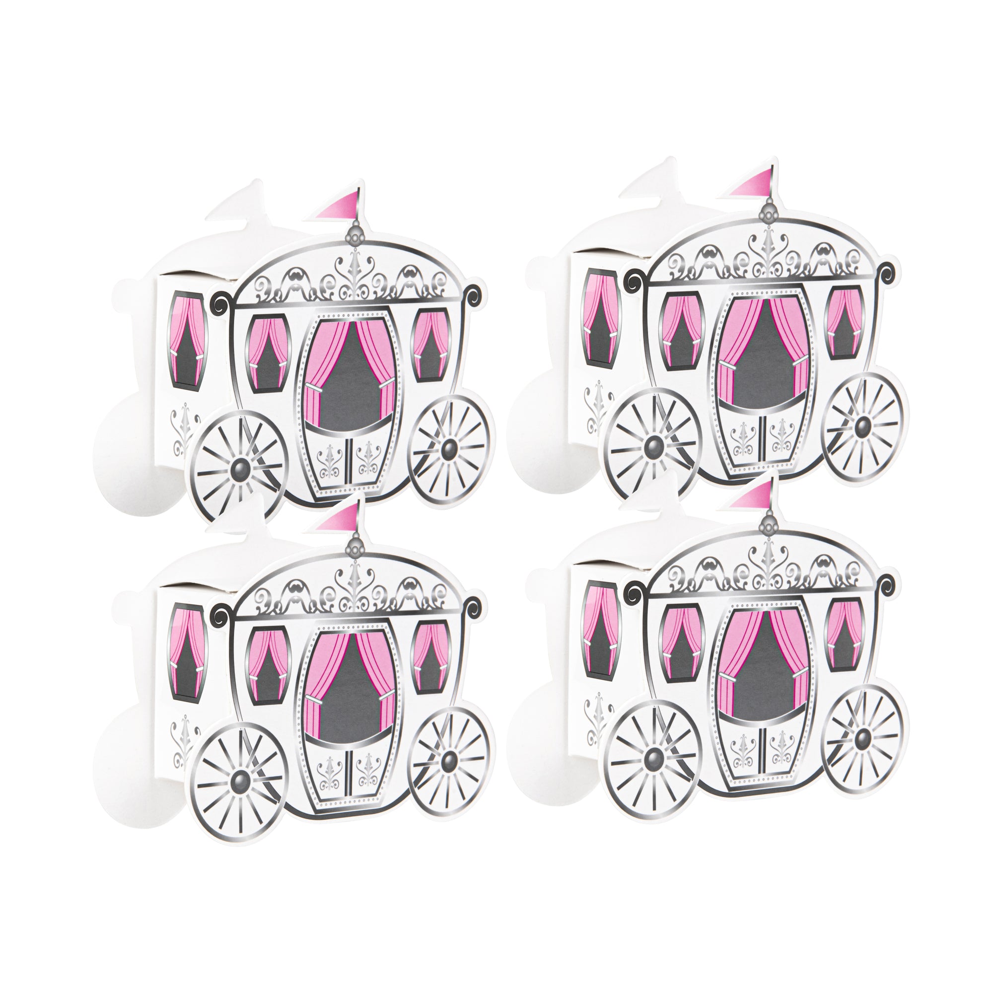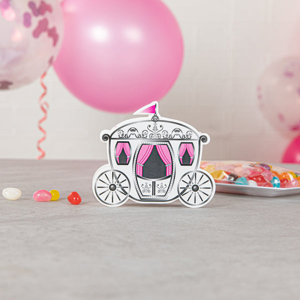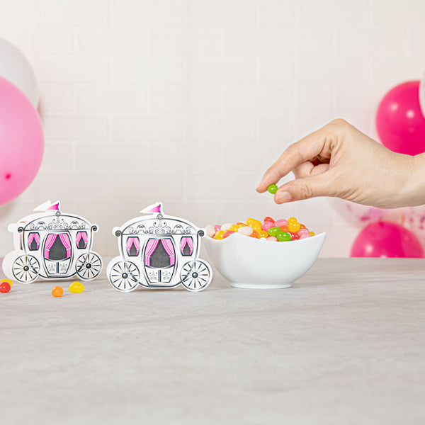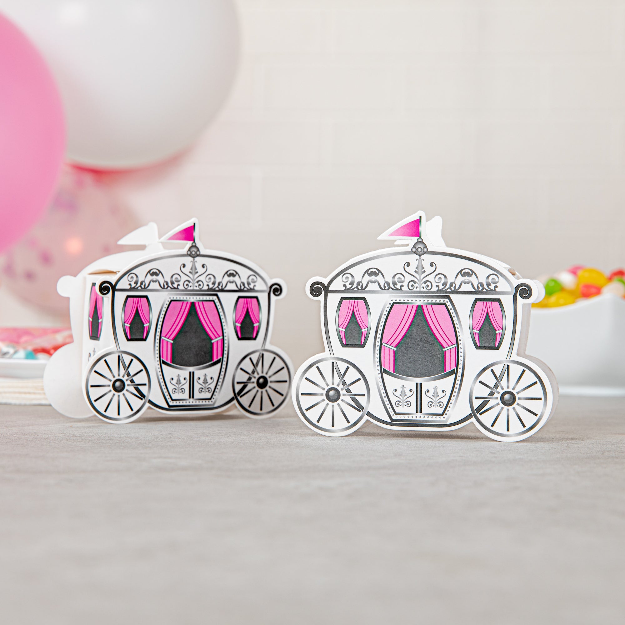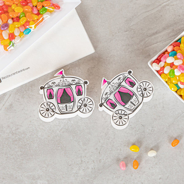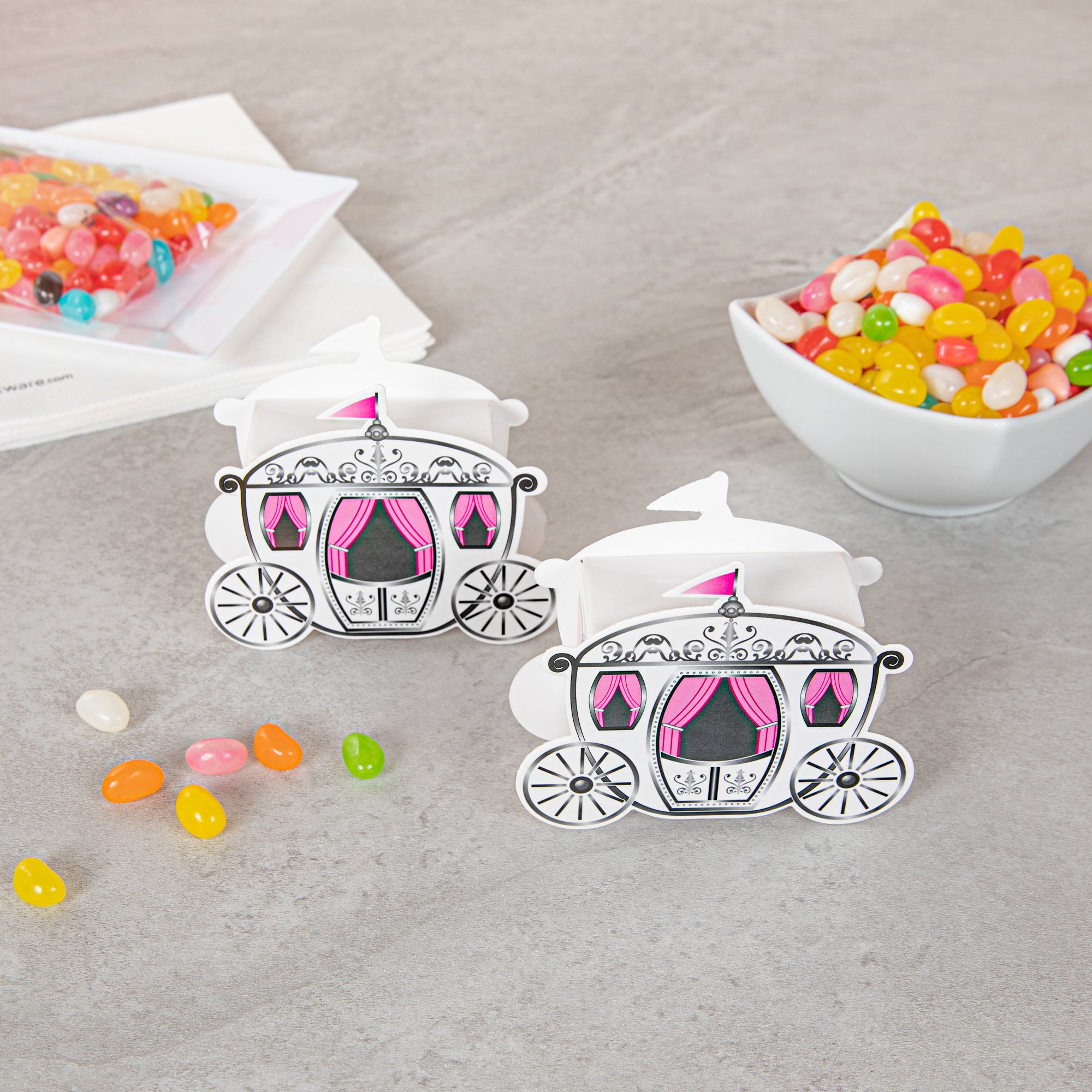 Have your treats ready for the ball with our Pastry Tek White Paper Princess Carriage Candy and Gift Boxes. Constructed out of premium paper, these Cinderella favor boxes securely hold candies. These candy favor boxes are designed with an enchanting image of a royal carriage attached to both sides of the box for fun packaging. Plus, the pink curtains on these carriage candy boxes match any princess birthday party, wedding, baby shower, candy shop, or bakery. These fancy candy boxes are recyclable and commercially compostable. To speed up the disposal process, these biodegradable candy boxes are disposable. Shipped flat for space-saving storage, these paper candy boxes can be quickly assembled. These princess gift boxes measure 2.75 inches in length by 1.25 inches in width by 1.5 inches in height. Shipped in a 100 count box. This item will only degrade outside of the traditional solid waste stream.