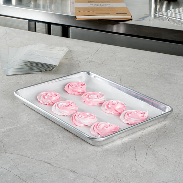 Prevent sticking and streamline your baking process effortlessly. The Pastry Tek Non-Stick Parchment Paper provides a seamless, non-stick surface with its double-sided silicone coating, allowing baked goods to release cleanly from the pan. Designed with a greaseproof construction, these compostable pre-cut baking sheets reduce the residue left behind, minimizing scrubbing and maintaining pristine pans. Each sheet is pre-cut to 9 inches by 13 inches, fitting standard quarter-size sheet pans perfectly and eliminating the time spent on manual cutting. Made from white silicone-coated paper, these non-stick parchment liners withstand high oven temperatures, making them ideal for a variety of baking needs from cookies to pastries. Enhance your kitchen efficiency and ensure a smooth baking experience with this indispensable kitchen tool. Each order includes 200 Pastry Tek Non-Stick Parchment Papers.