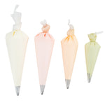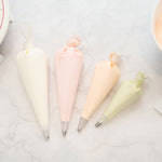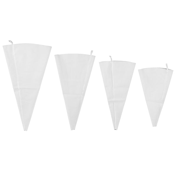 Pipe several colors onto tiered cakes or themed cupcakes using our Pastry Tek White Silicone Pastry Piping Bag 4-Piece Set. Perfect for multi-purpose decorating, these frosting bags arrive in 4 different sizes so you can easily fill and pipe a variety of colors all at once. Crafted with high-quality silicone, these food grade icing piping bags ensure a safe way to frost sweets. Featuring a durable yet soft design, the bags in this cake piping kit can be quickly trimmed to any size without the worry of tears or rips. To create intricate designs with ease, these frosting bags are lightweight and comfortable to hold. The classic white finish of these frosting bags creates a seamless look that perfectly matches the rest of your baking supplies. These icing piping bags are conveniently reusable and can be hand washed after use to maintain their appearance and quality. This cake piping kit includes 4 piping bags that measure 10.25 inches in length by 6.2 inches in width, 12 inches in length by 6.25 inches in width, 14 inches in length by 7.25 inches in width, and 16 inches in length by 8.75 inches in width. Shipped in a 1 count box.