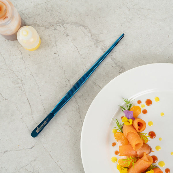 Welcome to the world of precise culinary creations with our Perfect Point Titanium Blue Stainless Steel Short Straight Tweezers. Manufactured from blue titanium stainless steel, these food plating tweezers are as durable as they are visually pleasing and ready for demanding kitchen scenarios. The straight designs of these blue tweezers, coupled with fine-pointed tips, are tailor-made for precision plating, ensuring excellent control with delicate garnishes and intricate food accents. Ideal for both hot and cold food, these stainless steel tweezers stand for multipurpose convenience. Measuring 9.5 inches in length, these food tweezers optimize grip, enabling you to present your food artistry with optimum detail and easy control. Sold in 1 count box.