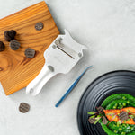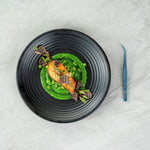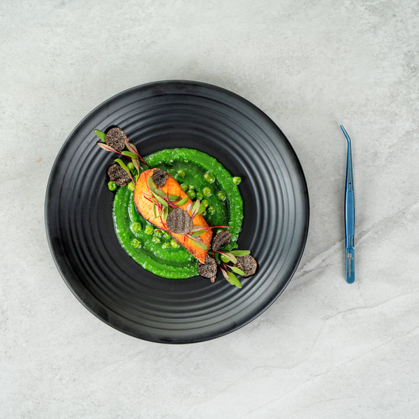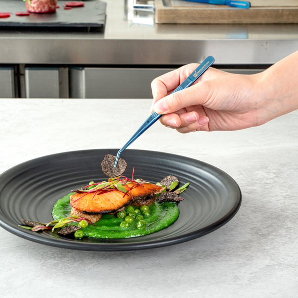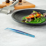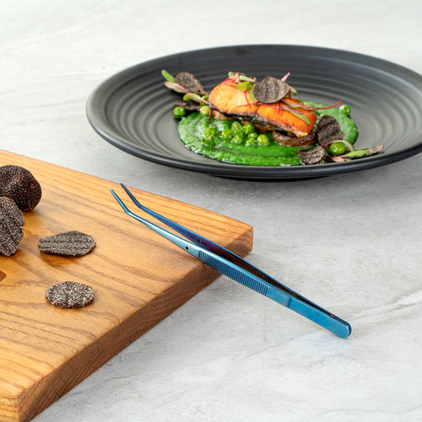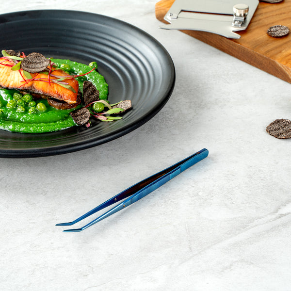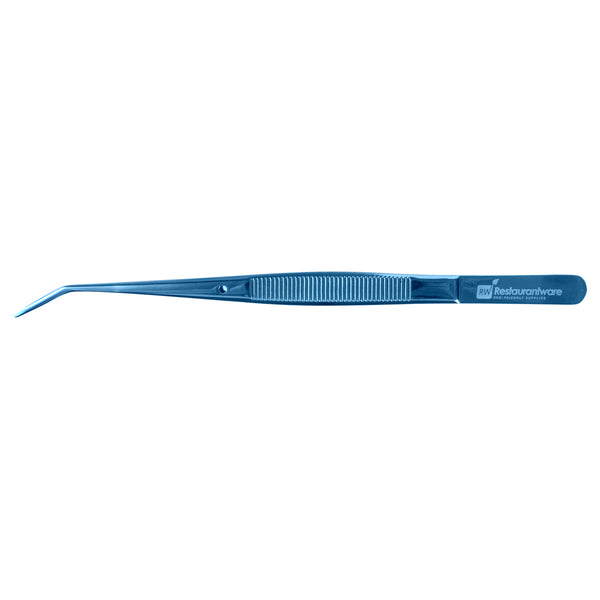 Elevate your culinary presentations with our Perfect Point Titanium Blue Stainless Steel Slant Nose Tweezers. Crafted from blue titanium stainless steel, these food tweezers are not only visually striking but also exceptionally durable, adept at withstanding demanding kitchen atmospheres. The innovative slant nose designs and finely pointed tips of these stainless steel tweezers make precision plating simple, providing great control in handling delicate garnishes or intricate decorative elements. Suitable for hot and cold food preparation, these plating tweezers offer ultimate kitchen convenience. Measuring 6.25 inches in length, these plating tweezers provide a comfortable grip, facilitating ease in presenting your culinary masterpieces with detail and finesse. Sold in 1 count box.