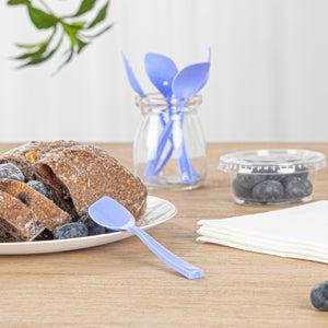 Bring a playful pop of color to your freshly scooped ice cream with our Coppetta Periwinkle Plastic Petal Spoons. Made from premium plastic, these frozen yogurt spoons have strong and sturdy handles that are built to resist breaking under the weight of heavy bites. Featuring a unique shovel-like shape, these small dessert spoons are excellent tools for enjoying giant ice cream sundaes and big bowls of gelato. The sleek pointed tip of these disposable spoons effortlessly slides into tightly packed scoops of ice cream and towering mounds of sorbet. With a unique angled shape, these plastic spoons ensures that your customers can easily scoop up every last delicious bit. For a swift after-service cleanup, these petal spoons are disposable. Each cake spoon measures 4.5 inches in length by 1 inch in width, making them ideal for serving alongside all types of frozen treats and delectable desserts. Shipped in a 500 count box.