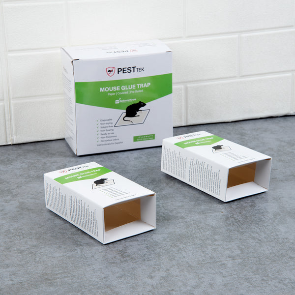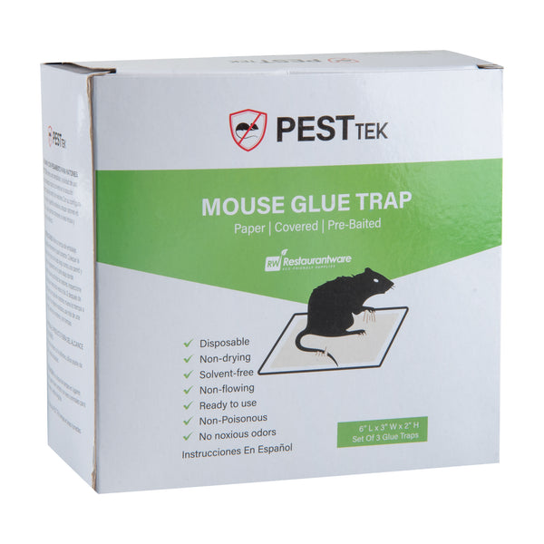 Control mice infestations with our Pest Tek Paper Mouse Glue Traps. The covered design of these pre-baited mouse glue traps with a thermoformed plastic collection tray makes them discreet and ready to use. Featuring a powerful adhesive that is non-drying, non-flowing, and solvent-free, these covered glue traps keep the pests in place. With a non-poisonous adhesive, you can dispose of these bond traps safely with no noxious odors. To easily place around facilities, these sticky trap boxes measure 6 inches long by 3 inches wide by 2 inches tall to fit in tight spaces. These durable glue pads are set in packs of 3 for efficient use. Sold in a 10 count box.