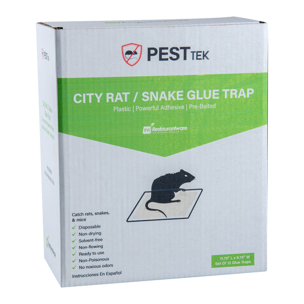 Provide effective pest control with our Pest Tek Plastic City Rat / Snake Glue Trap. This pre-baited trap uses a powerful adhesive to securely catch rats, mice, and snakes with no escape. Non-flowing and non-drying, this solvent-free rat gum pad requires no mixing or mess. This glue pad is ready to use safely as it is non-poisonous and odorless. Durable and long-lasting, this disposable bond trap comes in a set of 12 double traps with holes to securely place it with wire or nails. Measuring 11.75 inches by 9.75 inches, this large trap is ideal for catching even the biggest pest. Sold in a 1 count box.