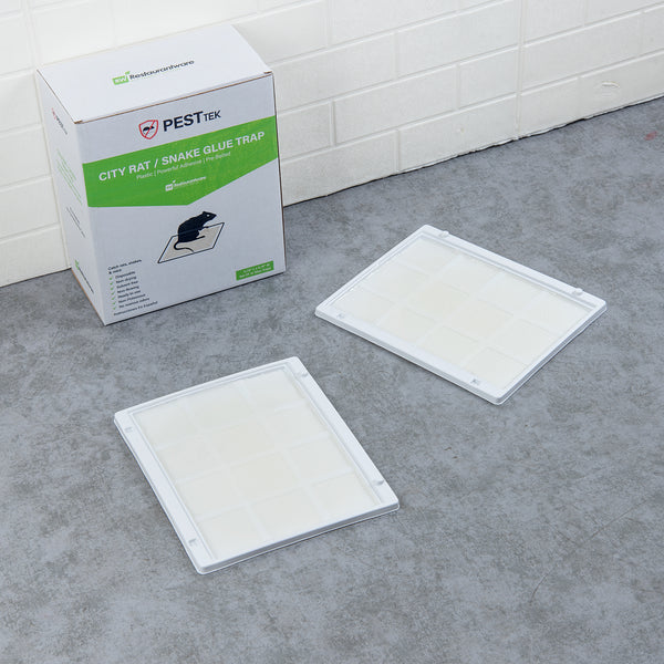 Provide effective pest control with our Pest Tek Plastic City Rat / Snake Glue Traps. These pre-baited traps use a powerful adhesive to securely catch rats, mice, and snakes with no escape. Non-flowing and non-drying, these solvent-free rat gum pads require no mixing or mess. These glue pads are ready to use safely as they are non-poisonous and odorless. Durable and long-lasting, these disposable bond traps come in a set of 12 double traps with holes to securely place them with wire or nails. Measuring 11.75 inches by 9.75 inches, these large traps are ideal for catching even the biggest pests. Sold in a 10 count box.