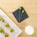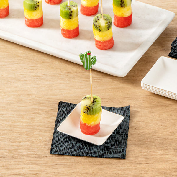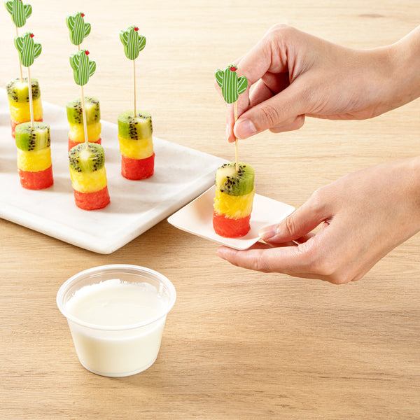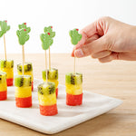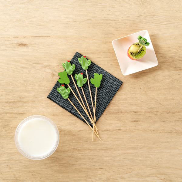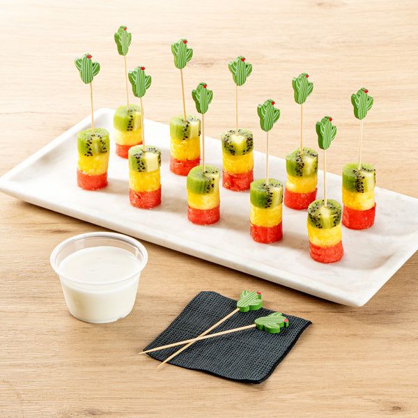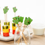 Elevate your culinary presentation with a trendy desert vibe. Trendy Presentation Pixy Bamboo Cocktail Picks feature a captivating cactus flower design, adding an eye-catching flair to appetizers and beverages while serving as indispensable bamboo cocktail picks. Crafted from biodegradable bamboo, these cocktail picks provide a splinter-free surface, ensuring safe handling during bustling services. Their sharp ends effortlessly pierce through a variety of ingredients, facilitating efficient assembly, making them ideal decorative food picks for garnishing cocktails or skewering hors d'oeuvres. Measuring 4.7 inches in length, these picks are both hot and cold food-friendly, making them versatile cocktail garnish sticks suitable for any occasion. Enhance your foodservice offerings with these eco-friendly and commercially compostable picks, aligning with sustainable practices. Sold in a 100 count box.