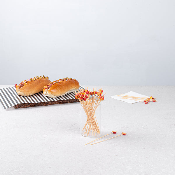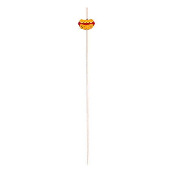 Cook and serve hot dogs stylishly with our Pixy Bamboo Hot Dog Skewers. Designed with a hot dog accent on one end, these disposable grill skewers add a fun element to your presentations while making meals easy to identify. Crafted from bamboo, these sandwich skewers are lightweight and sturdy to make them easy to handle while grilling or eating. Featuring a splinter-free design, these bamboo skewers keep your guests from injuring themselves to ensure an enjoyable experience. Ideal for practicing sustainability, these bamboo decorative picks are biodegradable and compostable to reduce landfill waste. Built with a sharp end, these disposable skewers allow you to effortlessly pierce through appetizers, entrees, and more. These hot dog picks measure 6 inches long for holding entire sausages. Sold in a 1000 count box.