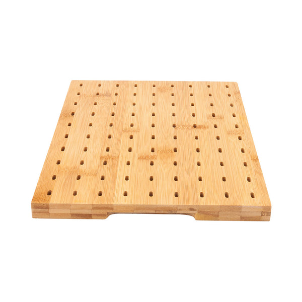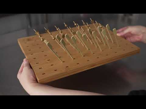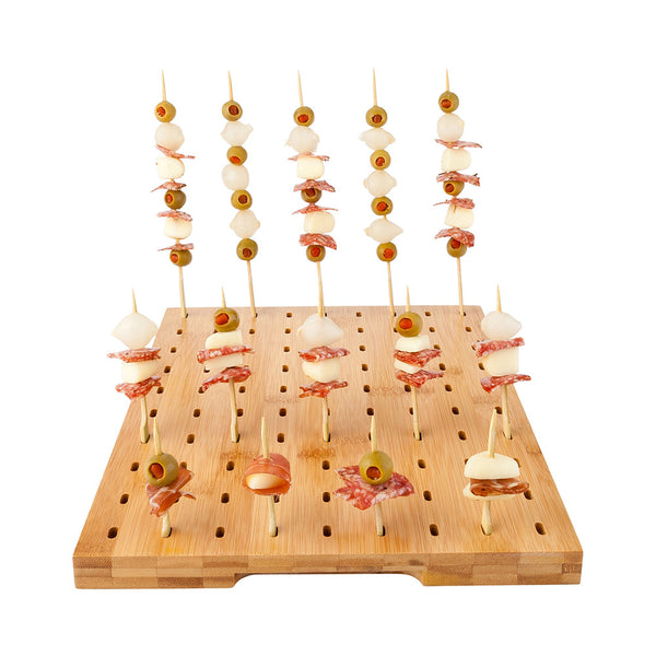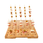 Our Natural Bamboo Paddle Pick Stand / Skewer Holder provides a quick, easy, and hands-free serving solution for appetizer skewers. Made from premium bamboo, this paddle skewer stand is naturally chip-resistant and durable to maintain its exceptional design for long-lasting commercial use. With 90 holes to hold paddle picks, this bamboo pick stand is great for displaying large quantities of bite-sized dessert and appetizer skewers. With an all-natural finish, this appetizer skewer display stand makes a stylish statement and adds an elegant touch to the interior decor at your catered event, bar, or restaurant. This cocktail pick holder is designed to securely hold our Pixy paddle skewers (SKU: RWB0135, RWB0136, RWB0137, RWB0304, and RWB0309). Measuring 14.25 inches in length by 10 inches in width by 1 inch in height, this appetizer display is easy to wipe down after use to streamline your cleaning process. Sold in a 1 count box.