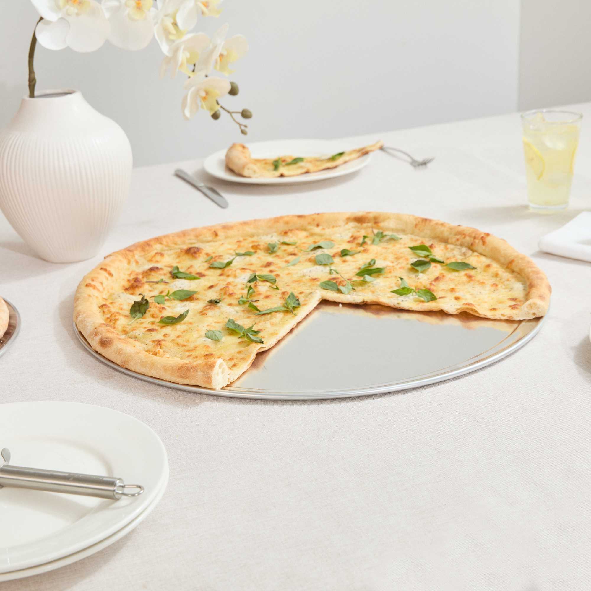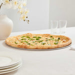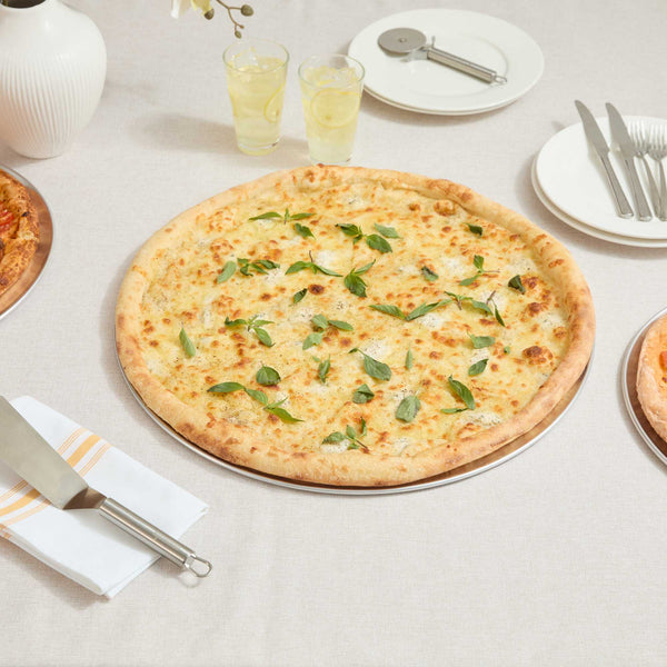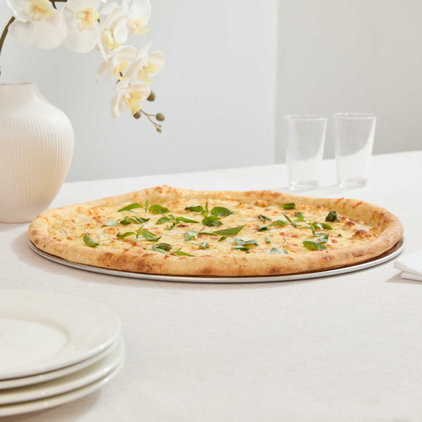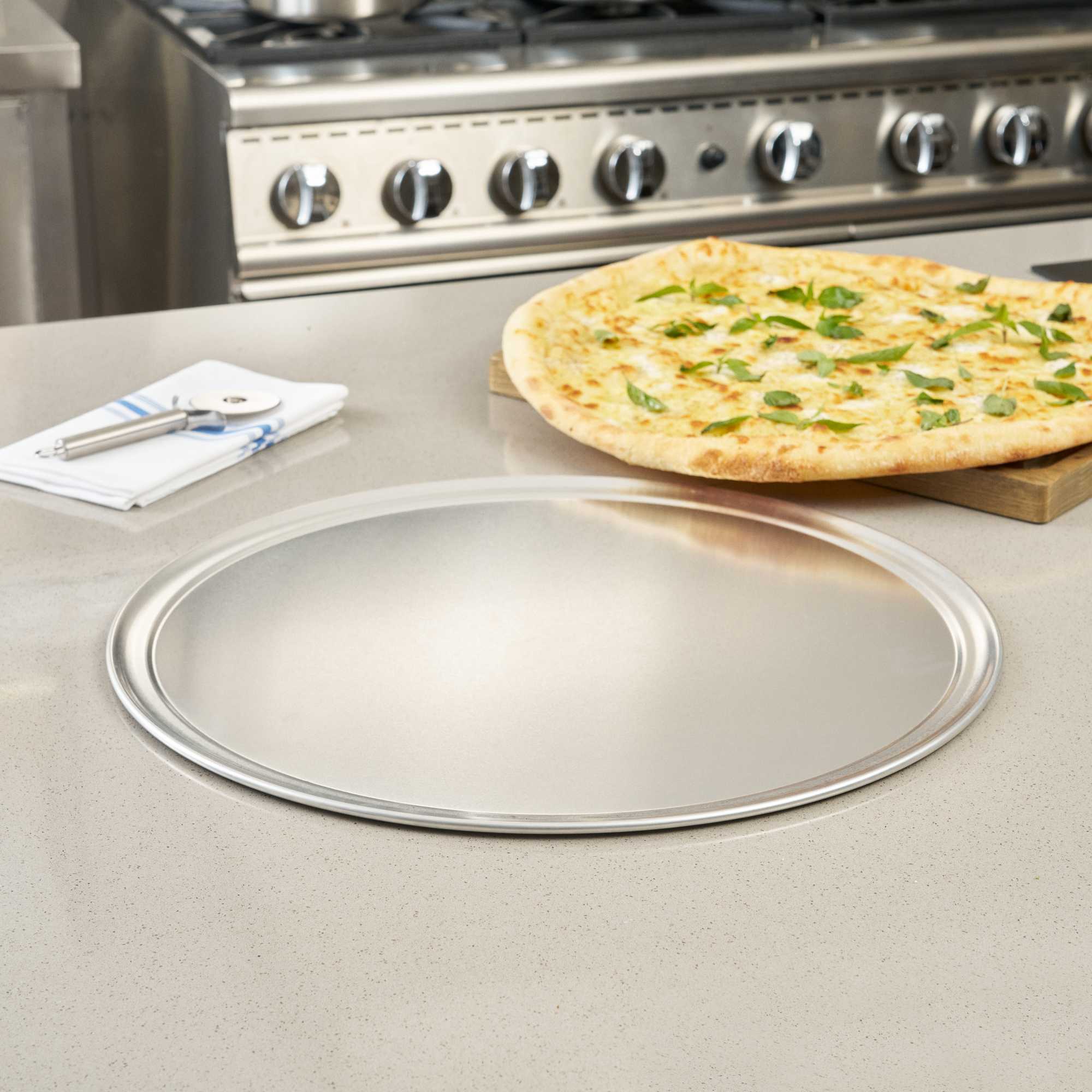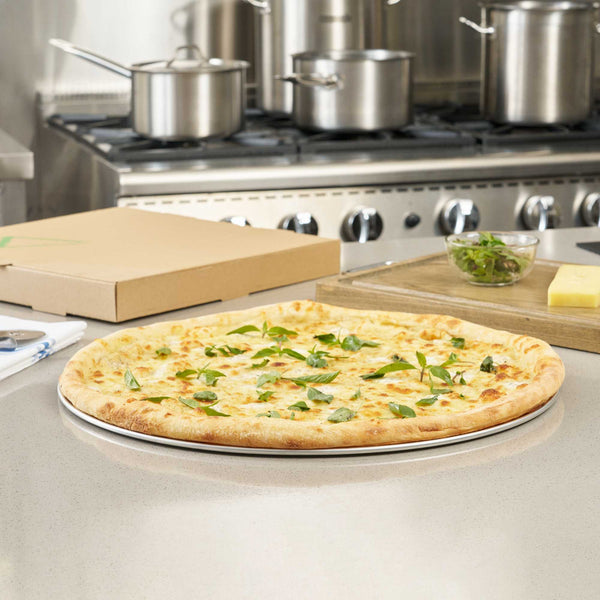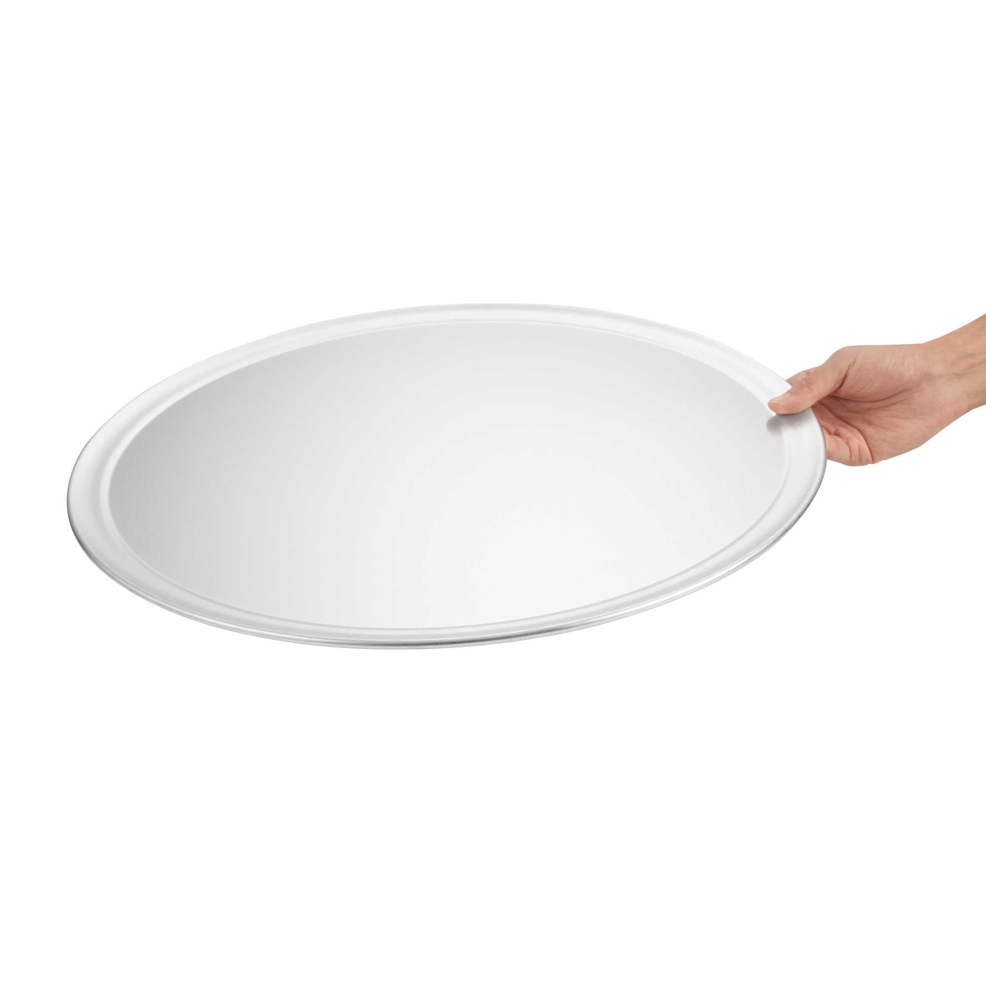 Ensure perfectly baked pizzas with this versatile aluminum pizza tray. The Pizzaly Heat Conductive Aluminum Pizza Tray features a wide rim that prevents spills and ensures stable handling, making it the ideal choice for professional kitchens and pizzerias. Crafted from lightweight Aluminum 1060, this round pizza pan provides excellent heat conductivity for even baking results, enhancing your foodservice operations by delivering consistent, delicious pizzas every time. Its 18-gauge thickness resists warping, making it durable in commercial kitchen environments, while the corrosion-resistant material ensures long-term use and easy maintenance. This 20 inch pizza serving tray is compatible with pizza cutters and ovens, making it adaptable to various kitchen setups. The sleek silver finish adds a professional touch, while the aluminum build supports sustainable practices. Elevate your pizza presentation and operational efficiency today. Sold in a 1 count box.