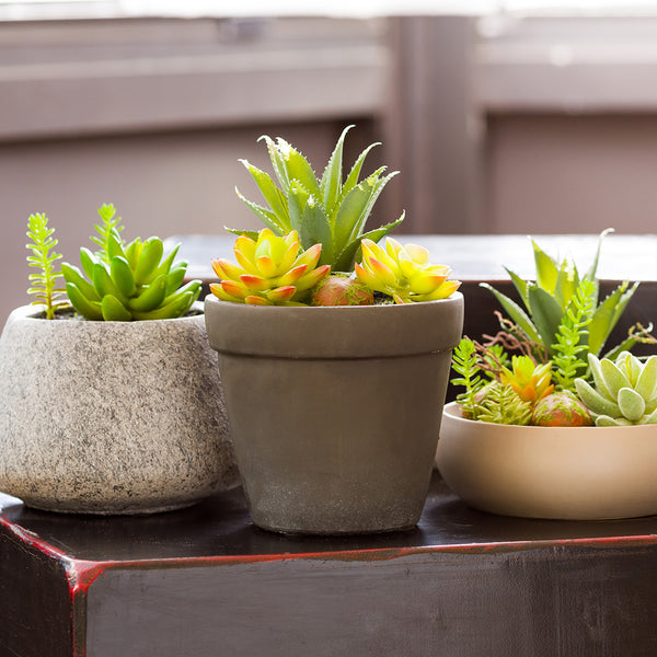 Accentuate and upgrade your existing decor with this Table Art Faux Succulent Arrangement in a Brushed Charcoal Cement Flower Pot. Featuring three different varieties of faux succulents, this large artificial succulent arrangement adds an interesting pop of color and greenery to any setting. The fake potted succulents feature flexible, realistic leaves to add authenticity to the arrangement, while the mossy gardening rocks add a rustic and lifelike touch. Housed in a contemporary cement flower pot with a brushed charcoal finish, these faux succulents can be dressed up or dressed down to liven up any space. Using artificial succulents in pots to enhance decor or table decorations is a simple way to incorporate natural-looking foliage into your establishment without any of the annoying upkeep or maintenance. This arrangement measures around 9 inches in height and 5.5 inches in diameter. Sold in a 1 count box.