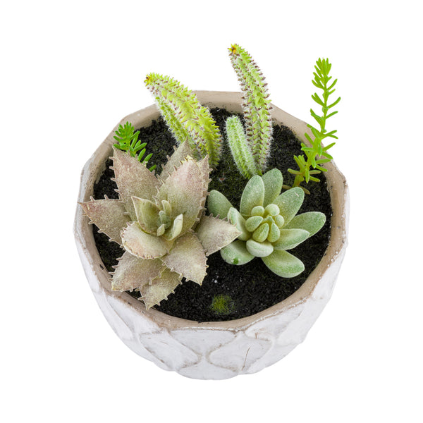 Add a statement piece to your centerpiece or restaurant decor with this Table Art Faux Succulent Arrangement in a stylish concrete planter. Filled with a vibrant assortment of faux succulent plants, this arrangement is a simple way to liven up any setting. The carefully molded leaves and lifelike spiked details add a natural and realistic feel to the small artificial succulent plants, while their neutral color palette ties in beautiful shades of green and light burgundy. Manufactured from flexible plastic and nestled in a modern concrete planter, this fake succulent arrangement adds an elegant touch of greenery to any establishment -- without any of the daily maintenance or upkeep! This faux succulent arrangement measures around 7.75 inches in height and 6 inches in diameter. Sold in a 1 count box.