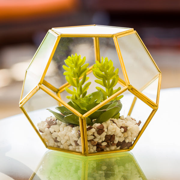 FAUX SUCCULENT ARRANGEMENT - PENTAGON GLASS TERRARIUM, GOLD