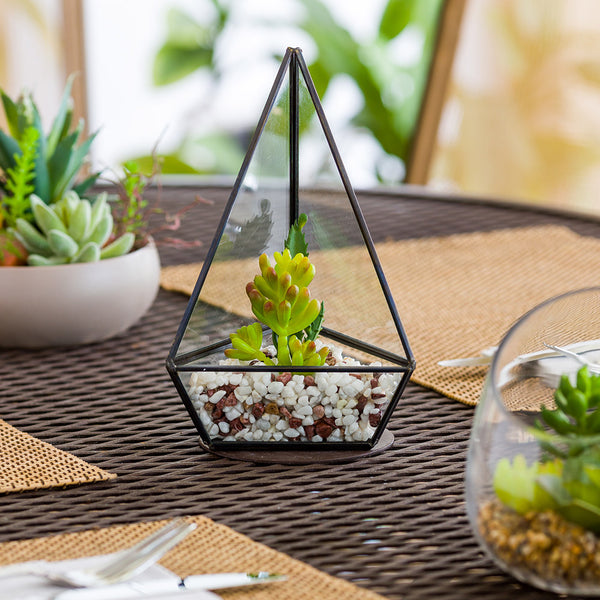 Add a modern touch to tables and centerpieces with this Table Art Faux Succulent Arrangement in a Triangular Glass Terrarium. Featuring realistic faux succulent plants in a variety of sizes, this artificial succulent arrangement easily livens up any space without the hassle or upkeep of real foliage. The triangular shape of the glass terrarium adds a contemporary feel to your countertops or centerpieces, while the black-coated stainless steel accents upgrade your existing decor with a sleek and chic look. Measuring 8.5 inches tall by 5 inches wide, this glass terrarium arrangement can be used to decorate restaurants, bars, catering events, and any other living or dining spaces. Sold in a 1 count box.