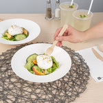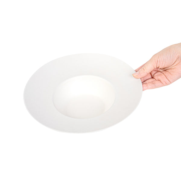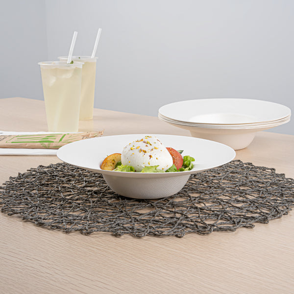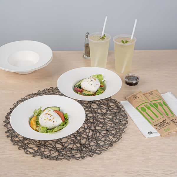 Accentuate your dining events with our Pulp Safe No PFAS Added 10-Ounce Round White Sugarcane / Bagasse Salad Bowls / Dessert Plates. Manufactured without added PFAS, these home compostable round bowls ensure a secure and delightful eating experience. These salad bowls are BPI Certified for commercial composting, making them a sustainable choice for your business. The unique wide-rim design of these dessert plates enhances the aesthetic charm of your meals while leaving a notable impression on your guests. Constructed from robust bagasse material, these home compostable white dishes mark their elegance and serve as a reliable medium for displaying a variety of tempting foods. Plus, these microwavable white bagasse bowls offer the convenience of quick and easy food reheating when required. Measuring 8.75 inches in diameter by 2 inches in height and containing up to 10 ounces, these multipurpose salad bowl plates provide ample space for serving a diverse range of tasty treats. Sold in a 100 count box. This item will only degrade outside of the traditional solid waste stream.