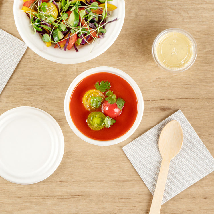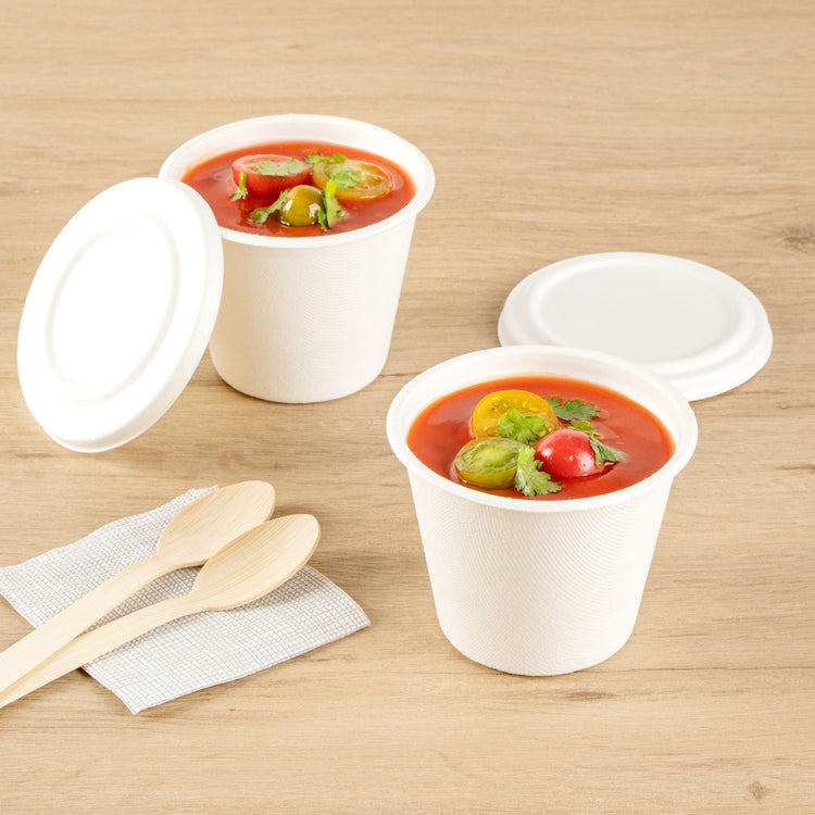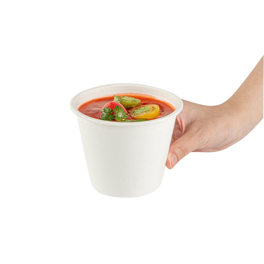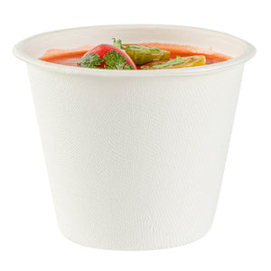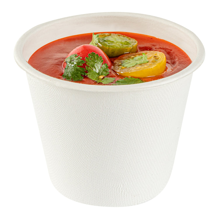 Enhance your eco-friendly foodservice with reliable compostable options. The Pulp Safe Compostable Soup Cup is crafted from sugarcane bagasse, providing an eco-friendly alternative to traditional plastic containers and supporting your sustainability initiatives. This compostable soup cup is designed with no PFAS added, ensuring food safety and aligning with health-conscious practices. Measuring 4.1 inches in diameter, this home compostable cup allows for easy disposal in home composting systems, reducing waste and promoting environmental responsibility. With a 15-ounce capacity, this round soup container is ideal for serving generous portions of soups, stews, and other hot or cold dishes, enhancing customer satisfaction. Its microwavable and freezable features offer flexibility in food storage, providing convenience for reheating or storing leftovers. Choose a microwave-safe cup that meets the needs of your eco-conscious clientele. Each order includes 100 Pulp Safe Compostable Soup Cups.