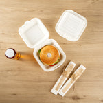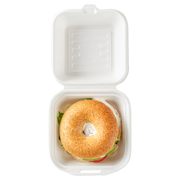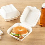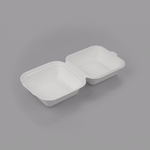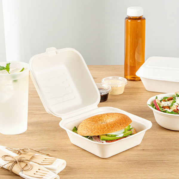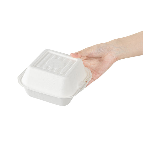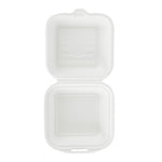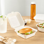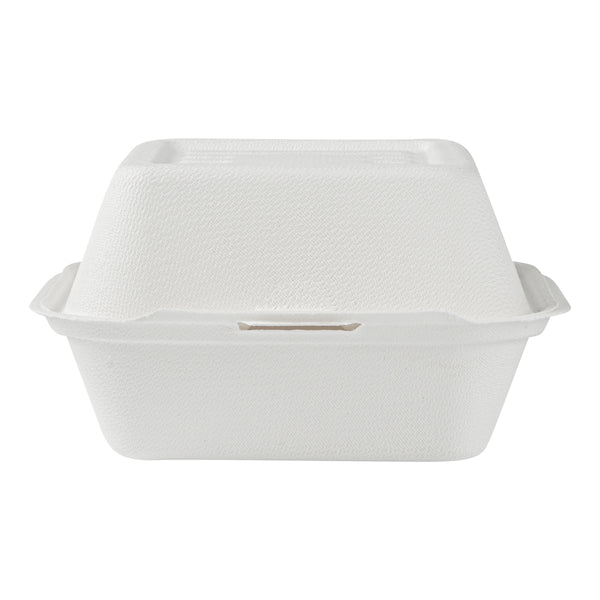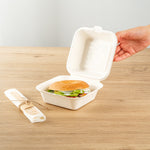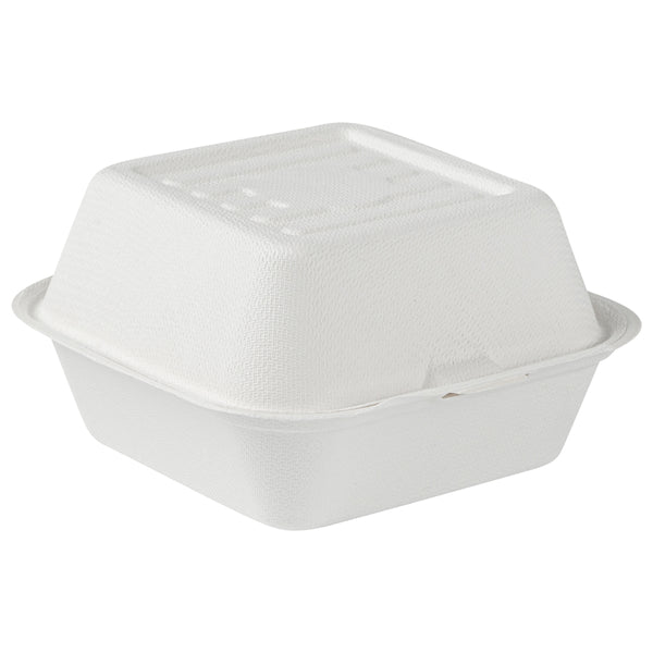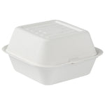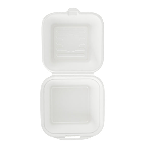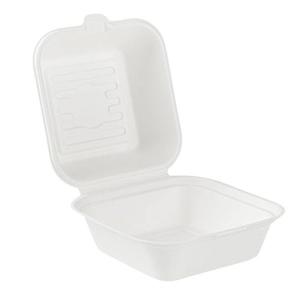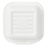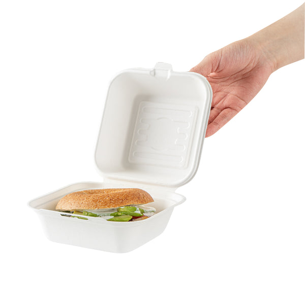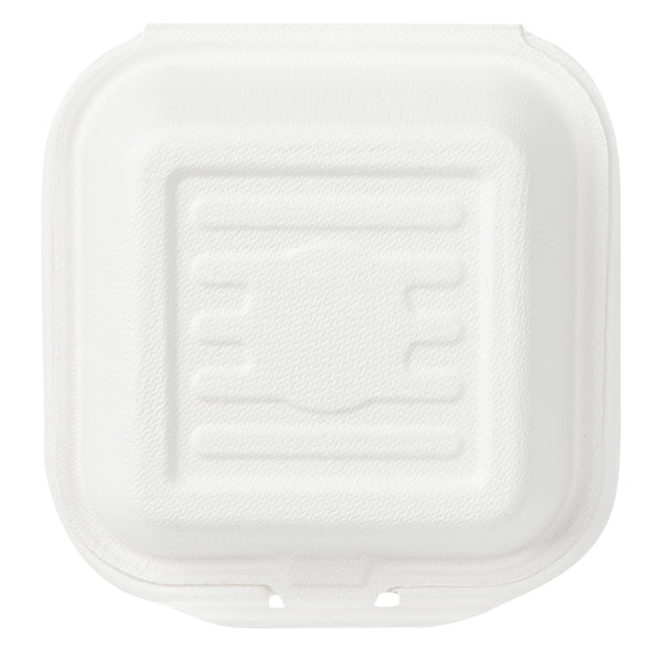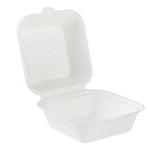 Deliver food to your customers in pristine condition with our Pulp Safe No PFAS Added 15-ounce Square White Sugarcane / Bagasse Clamshell Containers. These no PFAS added bagasse containers have been developed in strict adherence to state regulations, ensuring their compliance. Manufactured using sturdy bagasse material, these catering boxes won't break easily when carrying food. These disposable food containers are home compostable to seamlessly integrate into your everyday waste reduction efforts. Serve hot pasta or cold salads in these take out containers, as they are hot and cold friendly. The hinged lids and the snappy tab lock of these take out boxes secure the food inside during transit. Conveniently refrigerate foods with these freezable carryout boxes and then microwave them for consumption later. Measuring 6 inches long by 6 inches wide by 3 inches tall, these square take out boxes have a capacity of 15 ounces. Shipped in a 100 count box. This item will only degrade outside of the traditional solid waste stream.