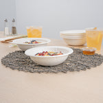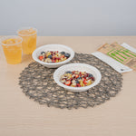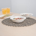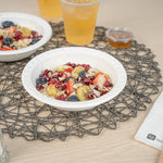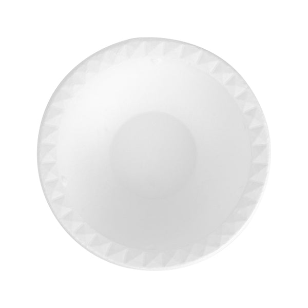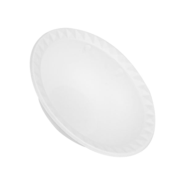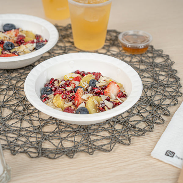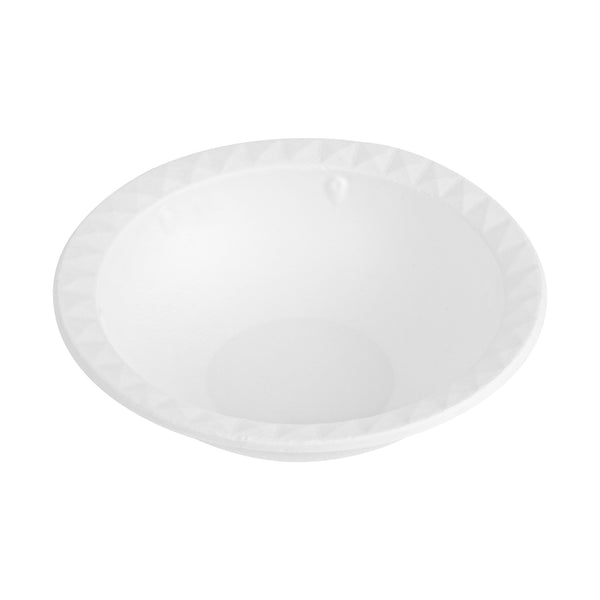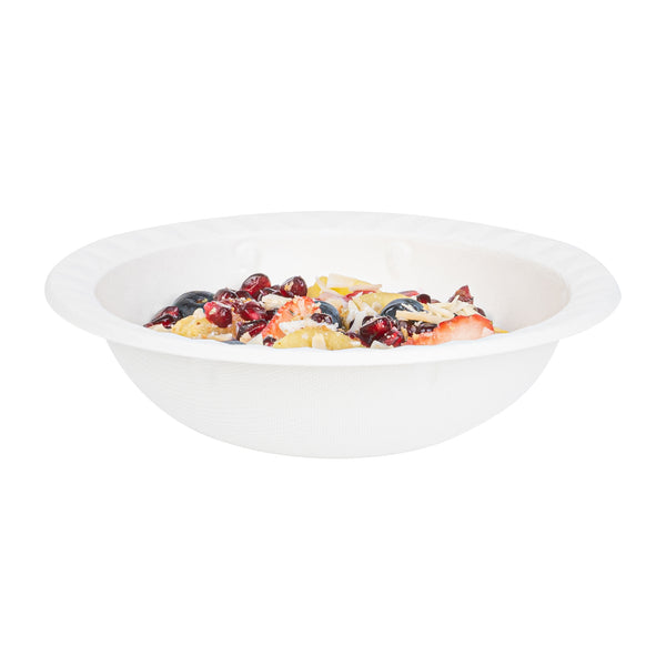 Enhance your meal serving with our Pulp Safe No PFAS Added 16-ounce Round White Sugarcane / Bagasse Bowls. These round home compostable bowls don't contain any added PFAS, ensuring a secure meal experience. Commercial composting Certified by BPI, these to go bowls meet your company's eco-friendly standards. The unique diamond rim design of these sugarcane bowls adds a touch of sophistication, certain to elevate the look of your dishes and impress your guests. Made from sturdy bagasse material, these biodegradable round bowls not only add a style statement but also serve as a dependable solution for presenting a variety of foods. Plus, these white bagasse bowls are microwavable, enabling the easy reheating of food. Measuring 6.75 inches in diameter by 2 inches in height, these disposable white bowls contain up to 16 ounces and are ideally proportioned for serving a multitude of dishes. Sold in a 100 count box. This item will only degrade outside of the traditional solid waste stream.