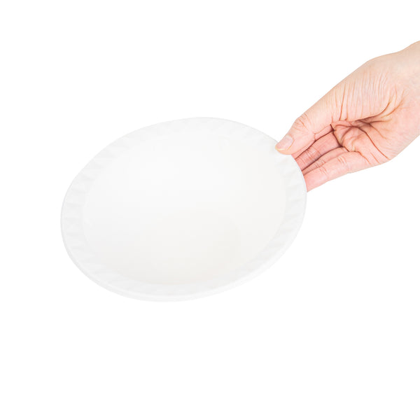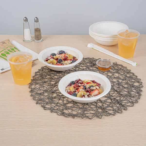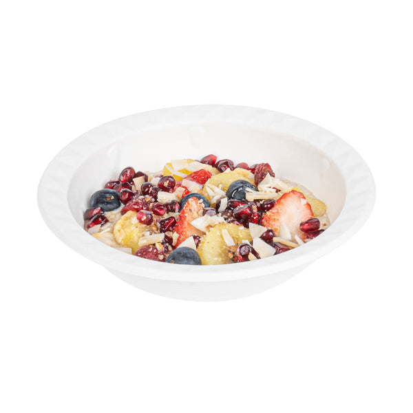Enhance your meal serving with our Pulp Safe No PFAS Added 16-ounce Round White Sugarcane / Bagasse Bowls. These round home compostable bowls don't contain any added PFAS, ensuring a secure meal experience. Commercial composting Certified by BPI, these to go bowls meet your company's eco-friendly standards. The unique diamond rim design of these sugarcane bowls adds a touch of sophistication, certain to elevate the look of your dishes and impress your guests. Made from sturdy bagasse material, these biodegradable round bowls not only add a style statement but also serve as a dependable solution for presenting a variety of foods. Plus, these white bagasse bowls are microwavable, enabling the easy reheating of food. Measuring 6.75 inches in diameter by 2 inches in height, these disposable white bowls contain up to 16 ounces and are ideally proportioned for serving a multitude of dishes. Sold in a 25 count box. This item will only degrade outside of the traditional solid waste stream.