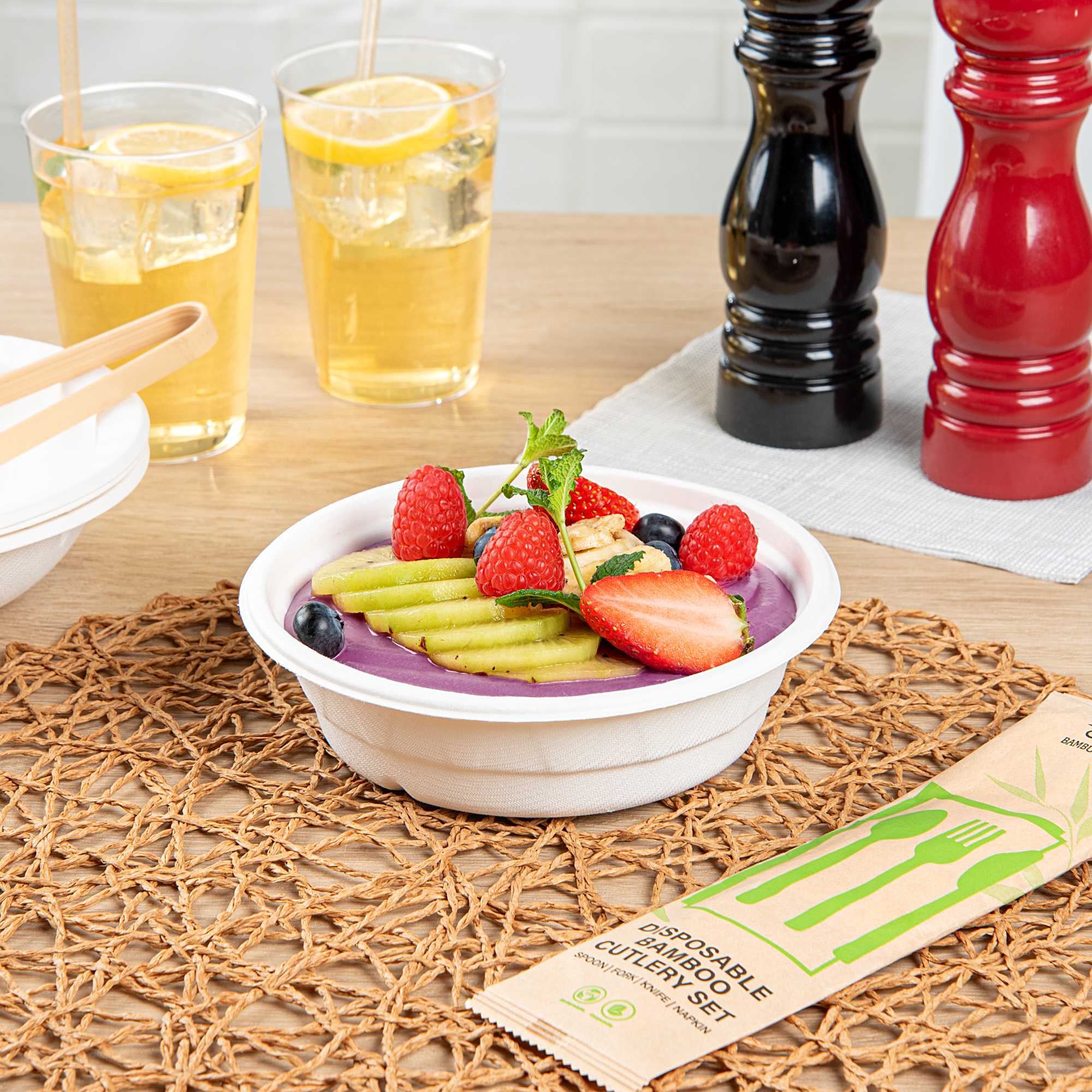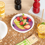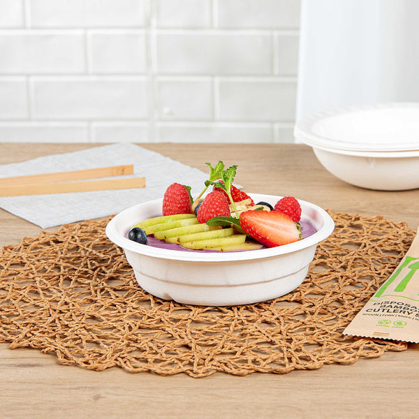 Elevate your food presentation with eco-friendly serving solutions. The Pulp Safe Round Bagasse Bowl combines sustainability and style, featuring a classic bright white color that enhances the look of appetizers and snacks. Made from bagasse, this sugarcane bowl is compostable, supporting environmentally conscious foodservice operations. Its robust construction ensures that it won't break or crack under moderate pressure, making it ideal for containing messy foods. The elegant diamond pattern offers a subtle textured look, adding a refined touch to your plating. This microwave-friendly bowl accommodates both hot and cold dishes effortlessly, allowing for versatile menu options from soups to salads. With dimensions of 6.30 inches in diameter by 1.72 inches in height, this freezer-friendly bowl is perfect for a variety of settings, including restaurants and catering events. Sold in a 25 count box.