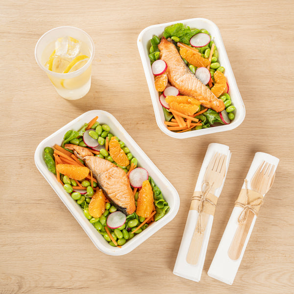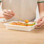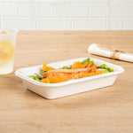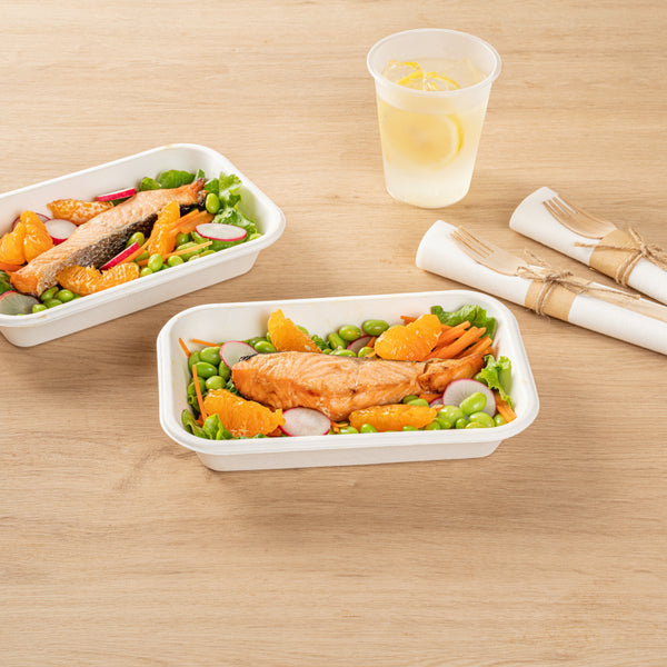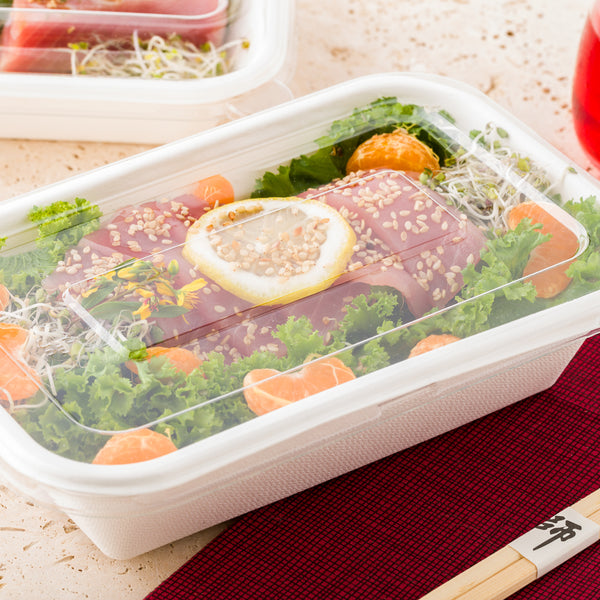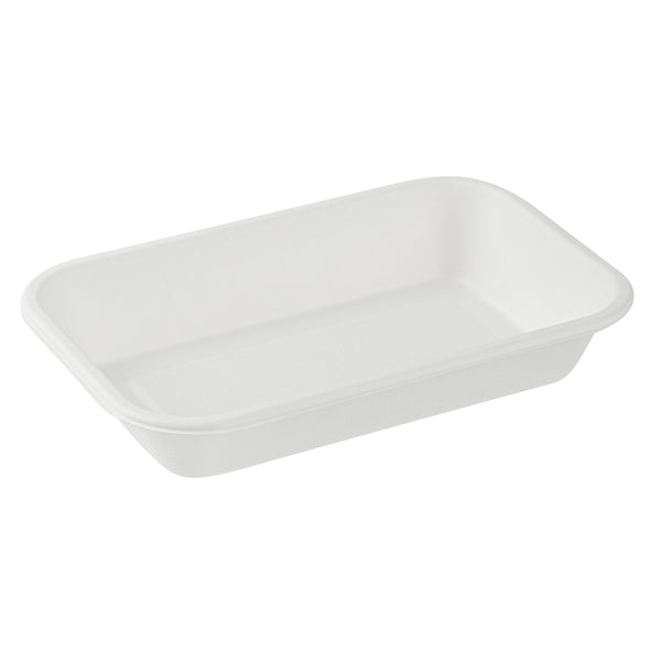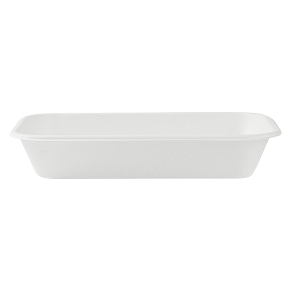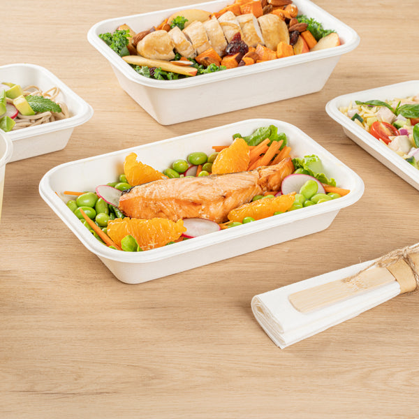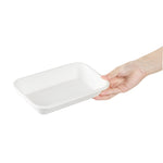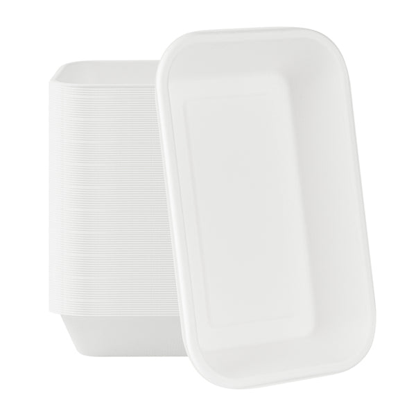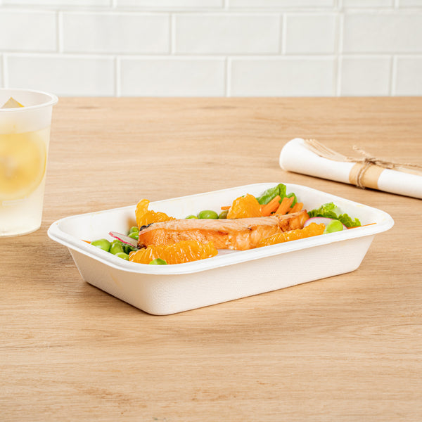 Our Pulp Safe No PFAS Added 24-ounce Rectangle White Sugarcane / Bagasse Containers ensure that the food you deliver to your customers remains in impeccable condition. By purposefully excluding PFAS additives, these bagasse containers safeguard against detrimental substances. Constructed using durable bagasse material, these catering containers can withstand transportation without breaking. Avoid the hassle of washing them up after a meal, as these disposable food containers are home compostable. These take out containers are suitable for serving hot pasta and cold salads, as they can withstand high and low temperatures. Conveniently refrigerate food in these freezable carryout containers and later heat it in the microwave for consumption. The extended rims of these pulp containers prevent spills and messes. Pair these no PFAS added bagasse containers with our compatible plastic flat or dome lids (SKU: RWA0636C and SKU: RWA0637C) to be always take out ready. Measuring 8.25 inches long by 5.5 inches wide by 1.5 inches tall, these rectangle containers have a capacity of 24 ounces. Shipped in a 100 count box. This item will only degrade outside of the traditional solid waste stream.