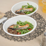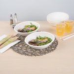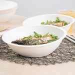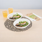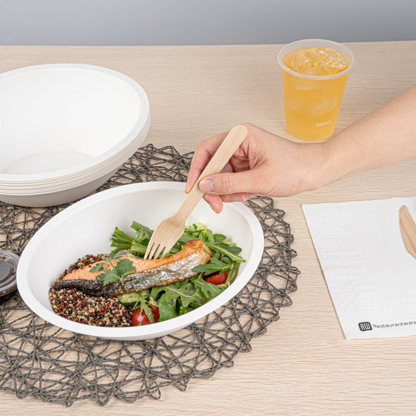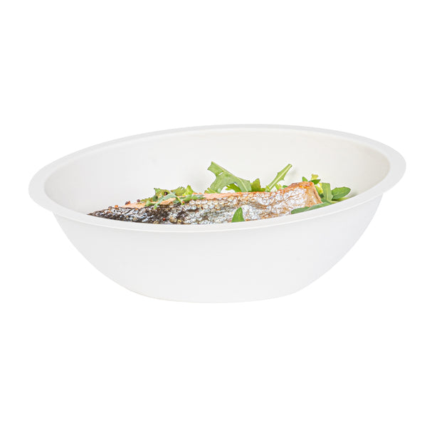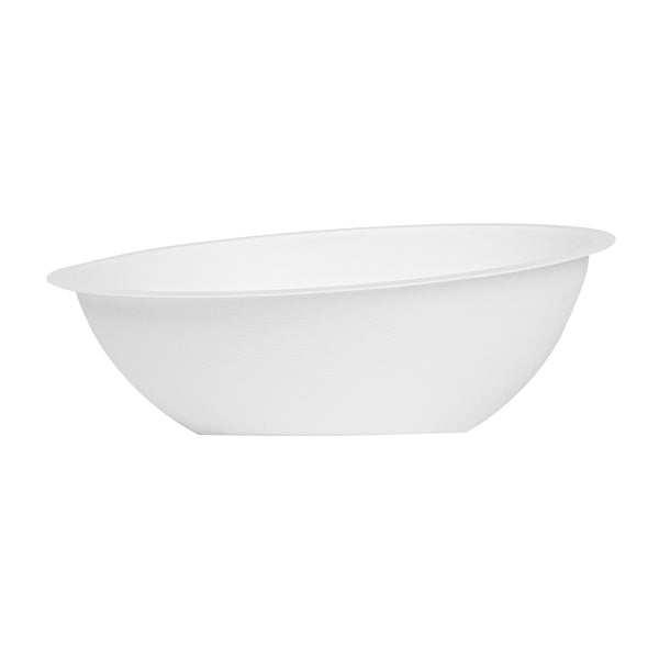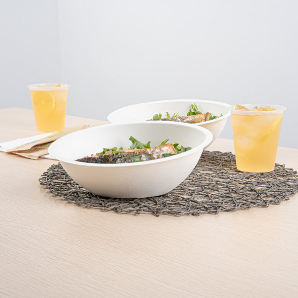 Elevate your dining presentation with our Pulp Safe No PFAS Added 27-ounce Oval White Sugarcane / Bagasse Bowls. These large oval bowls are designed without any added PFAS, ensuring a pleasant food experience. Produced from sturdy bagasse, these home compostable white bowls are a perfect medium to serve a wide selection of dishes. These sugarcane bowls are BPI Certified for commercial composting, ensuring they break down efficiently in industrial composting facilities without leaving harmful residues. The stylish design of these biodegradable sugarcane bowls brings a touch of sophistication aimed to enhance the appearance of your meals and leave a memorable impact on your guests. Measuring 8.75 inches in length by 6.75 inches in width by 3.25 inches in height, these disposable white bowls are capable of accommodating 27 ounces and are ideally suited for serving larger portions of tasty meals. Sold in a 100 count box. This item will only degrade outside of the traditional solid waste stream.