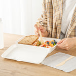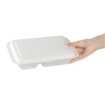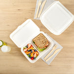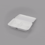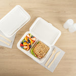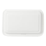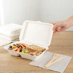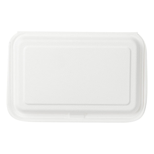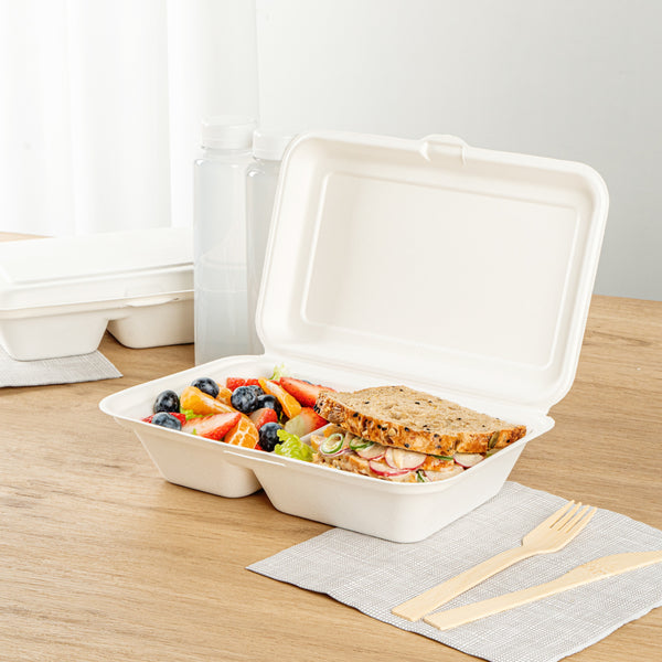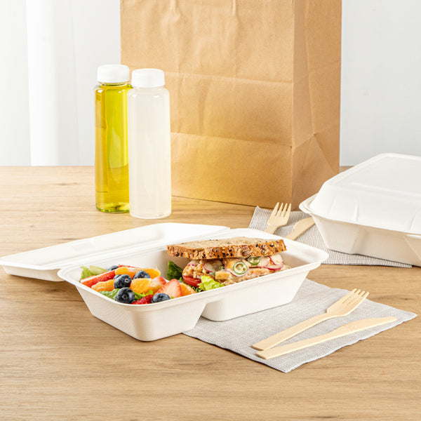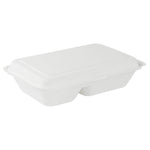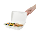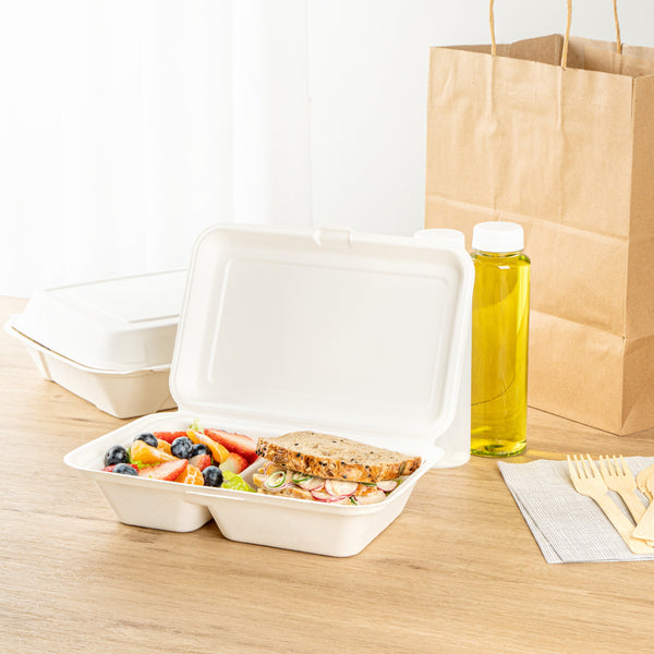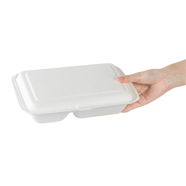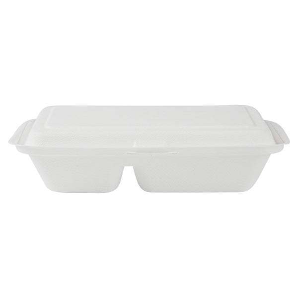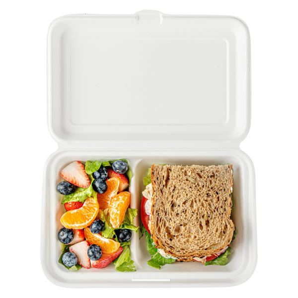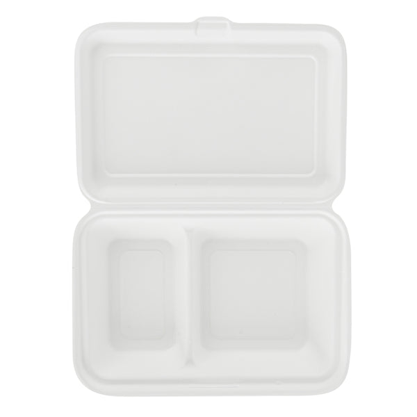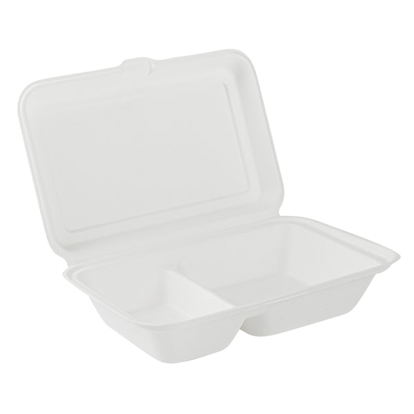 Eat dinner on the go without any mess with our Pulp Safe No PFAS Added 34-ounce White Sugarcane / Bagasse Clamshell Containers. Adhering to state regulations, these bagasse containers are have no PFAS intentionally added. These catering boxes have two compartments to keep foods separate, avoiding mixing. The sturdy bagasse construction of these take out containers lets you serve hot and cold foods without them breaking or folding. These disposable food containers are home compostable, making them a sustainable alternative to conventional plastic or foam disposables. Reheat the leftover food in these microwavable take out boxes and enjoy them later. These freezable carryout boxes come with a hinged lid and a durable tab lock to avoid spills. Measuring 9.5 inches long by 6.25 inches wide by 2.5 inches tall, these compartment food containers have a capacity of 34 ounces. Shipped in a 100 count box. This item will only degrade outside of the traditional solid waste stream.