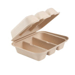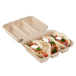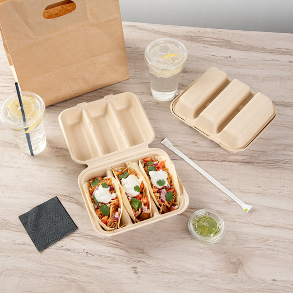 Presenting our Pulp Safe No PFAS Added Kraft Sugarcane / Bagasse Taco Clamshell Containers. Designed with no added PFAS, these rectangle plates ensure a secure and delightful dining occasion, emphasizing environmental responsibility. These home compostable bagasse containers are designed with a 3-compartment layout, allowing for excellent organization and separation of your delicious tacos. Made from robust sugarcane bagasse, these taco containers can withstand hot and cold temperatures. The clamshell design of these sustainable taco containers provides a secure enclosure, protecting the food inside from spills. These kraft clamshell containers have the added benefit of being both freezable and microwavable, offering the utmost convenience for food storage and reheating. With dimensions of 8 inches in length by 7.25 inches in width by 3.5 inches in height, these stackable takeout containers are compact yet spacious enough to comfortably house your delicious meals. Sold in a 100 count box. This item will only degrade outside of the traditional solid waste stream.