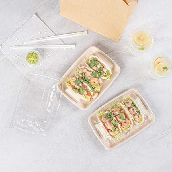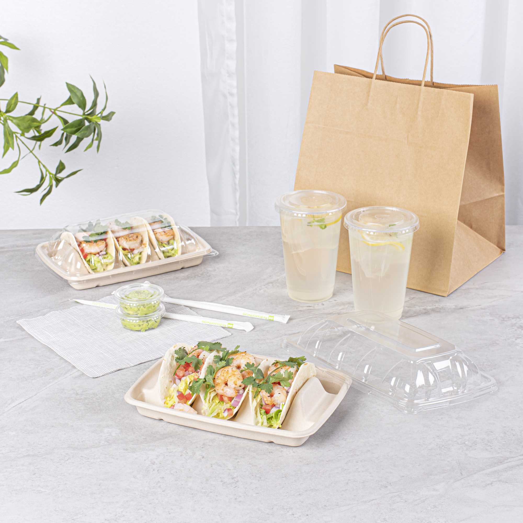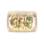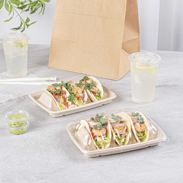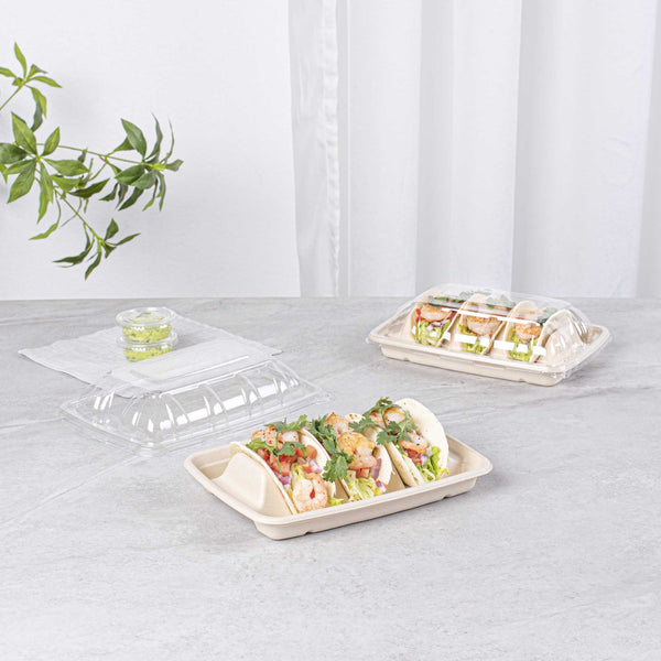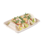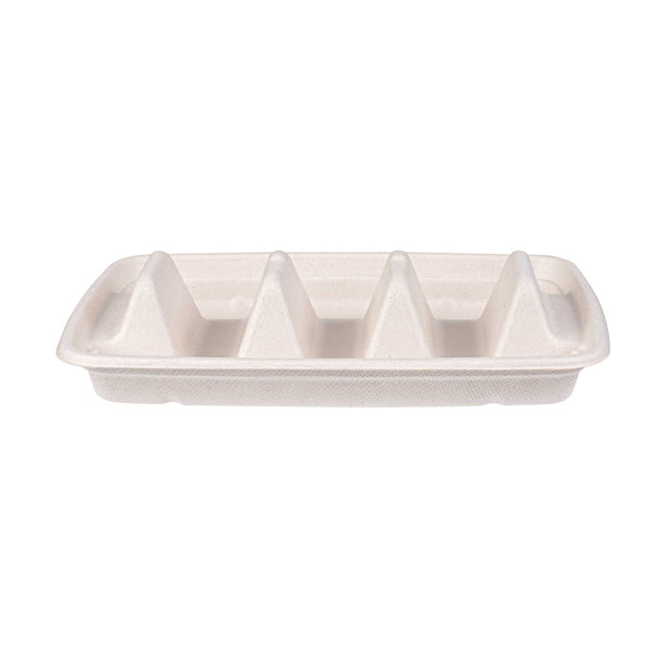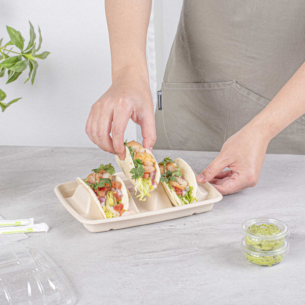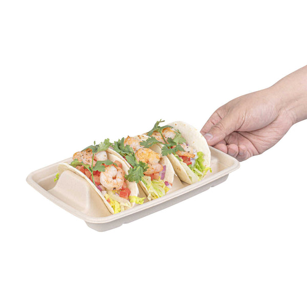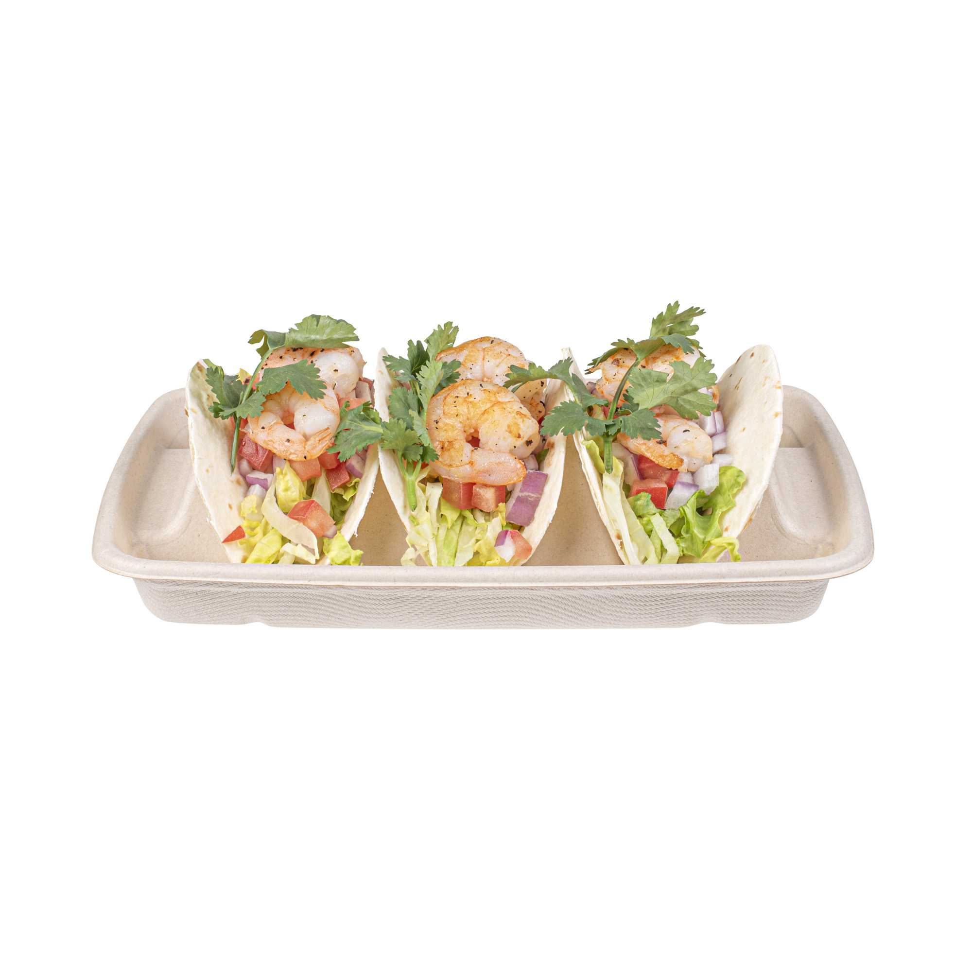 Ensure mess-free taco presentations with our innovative taco serving tray. The Pulp Safe Three-Compartment Bagasse Taco Shell Holder features three dividers that keep tacos upright and organized, enhancing your foodservice efficiency. Made from natural bagasse, these disposable taco holders are compostable, providing an eco-friendly solution for your establishment. The greaseproof design prevents spills and messes, making it an ideal taco shell holder for busy kitchens. With its microwave-safe material, you can reheat food without transferring containers, streamlining your kitchen operations. Measuring 8.9 inches in length, 6.4 inches in width, and 1.6 inches in height, this taco serving tray offers ample space for tacos, sandwiches, and burritos. Free from plastic, PFAS, and BPA, it ensures safe and healthy food presentation. Elevate your sustainable foodservice with this taco serving tray. Each order includes 50 Pulp Safe Three-Compartment Bagasse Taco Shell Holders.