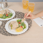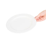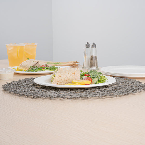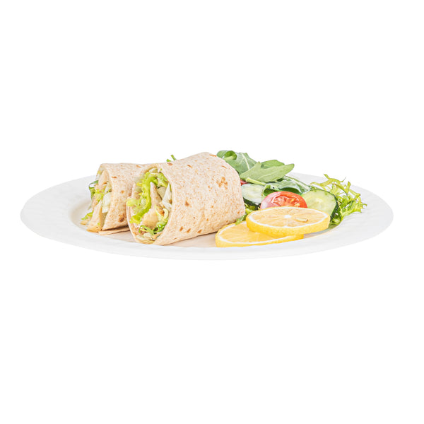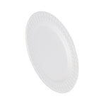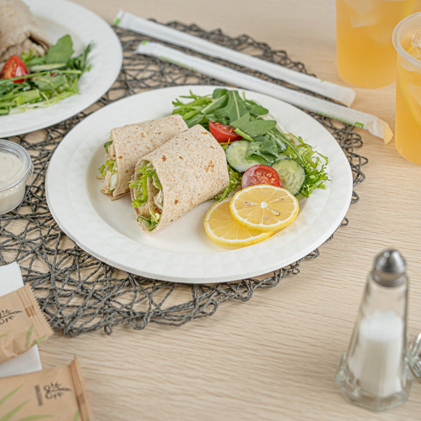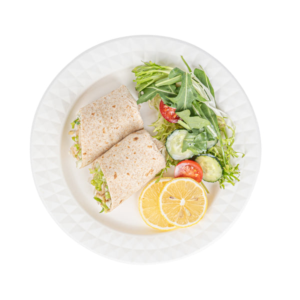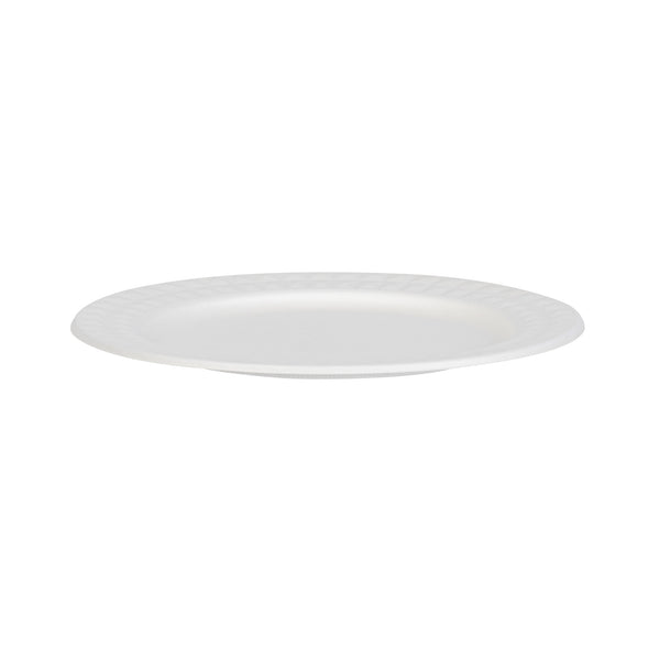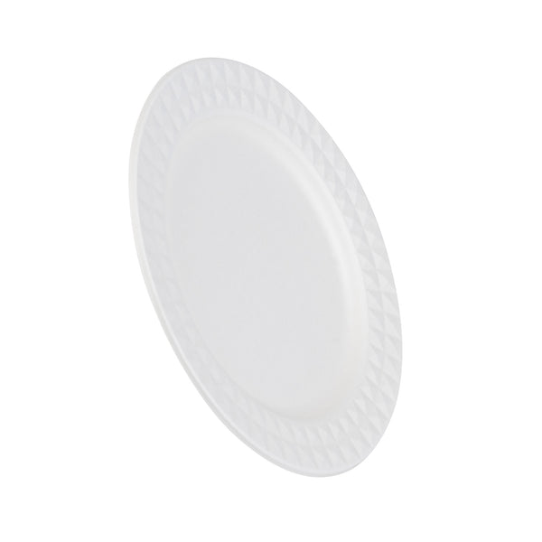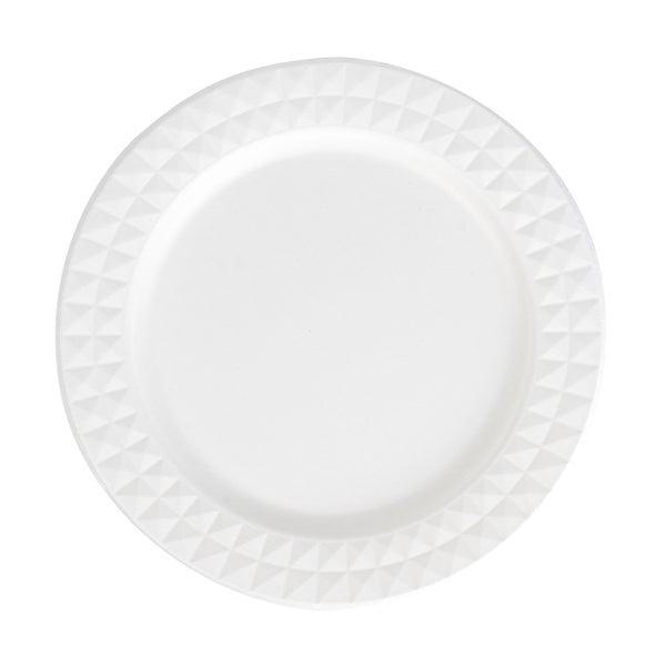 Elevate your dining experience with our Pulp Safe No PFAS Added Round White Sugarcane / Bagasse Plates. These home compostable round plates contain no added PFAS, ensuring secure food consumption. Plus, they are BPI Certified for commercial composting, ensuring that they align with high sustainability standards of your eco-conscious customers. With their unique diamond rim design, these sugarcane plates are sure to enhance the presentation of your meals and make a lasting impression on your guests. Crafted from durable bagasse material, these biodegradable round plates not only add a touch of elegance but also provide a reliable solution for serving all kinds of foods. These white bagasse plates are microwavable and can be used to preheat any food. Measuring 9 inches in diameter, these disposable white dinner plates are perfectly sized for serving a variety of dishes. Sold in a 25 count box. This item will only degrade outside of the traditional solid waste stream.