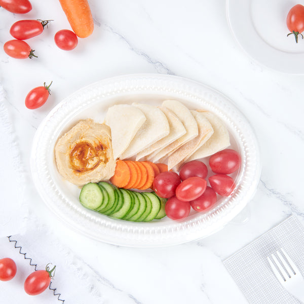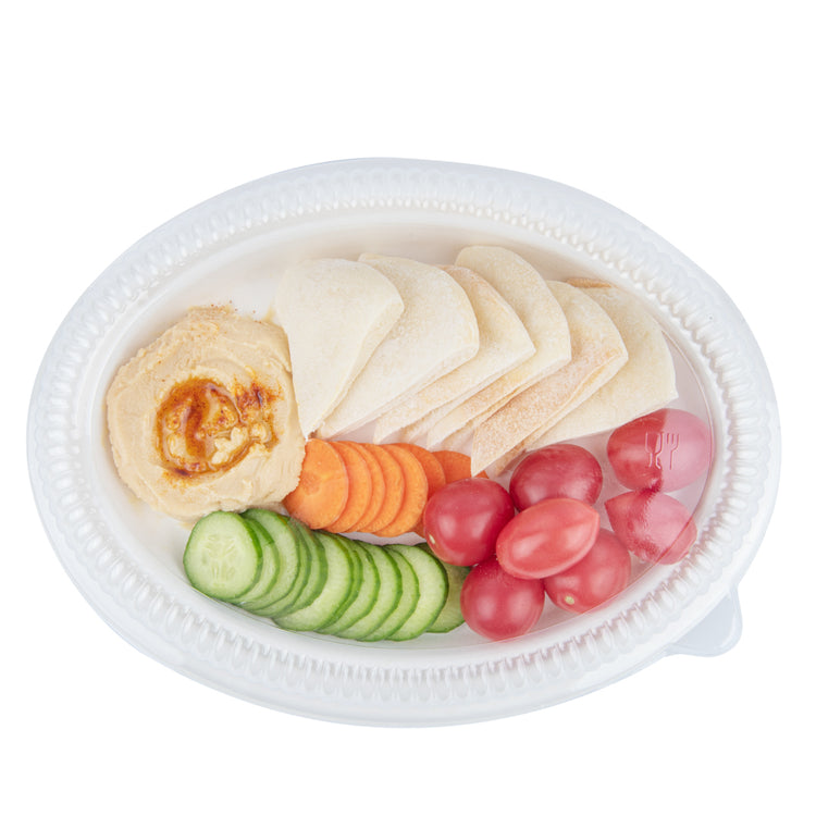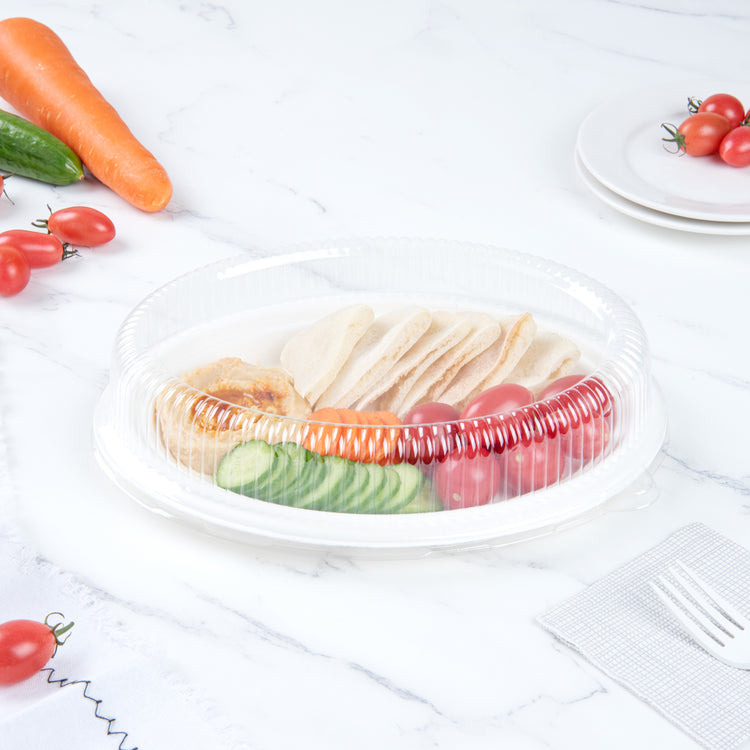 Easily deliver orders with our Pulp Safe Oval Clear Plastic Ripple Dome Lids. Combine our oval bagasse plates with lids to lock in meals and prevent messy spills (SKU: RWA1166W & RWA0186). Featuring a dome design, these oval lids provide ample space for hefty portions of appetizers or desserts. With a ripple texture, these plate lids give your dishes a chic look to impress guests. Designed with an easy-to-open tab, these dome lids allow for simple removal from plates so customers can readily access meals. The clear finish of these disposable lids provides a full view of foods for quick identification while handing out orders. Crafted from PET plastic, these clear plastic lids are shatterproof to keep food intact during delivery. Perfect for quick and easy cleanup, these dome lids are conveniently recyclable. These sturdy lids measure 10.5 inches in length by 8 inches in width and 2 inches in height. Sold in a 100 count box. Sugarcane plates are available and sold separately.