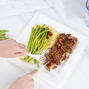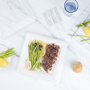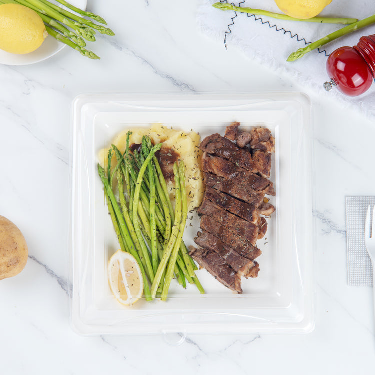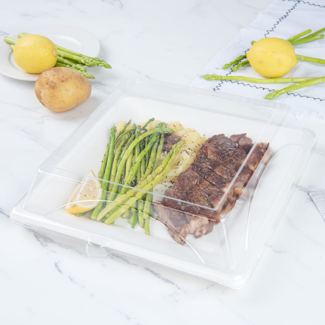 Keep salads fresh with our Pulp Safe Square Clear Plastic Dome Lids. Combine our large square bagasse plates with these clear plastic lids to lock in meals and avoid accidental spills (SKU: RWA1140W & RWA0190) . Featuring a dome design, these disposable lids provide ample space for garnishes and toppings. With a built-in tab, these to-go lids can be effortlessly removed from plates for quick and easy access to dishes. Designed with a clear finish, these take out container lids provide a full view of your foods for quick identification. Constructed from sturdy PET plastic, these food container lids are shatterproof, so you won't have to worry about leaks. Great for quick cleanup, these clear plastic lids are recyclable. These dome lids measure 10.75 inches in length by 10.75 inches in width by 2 inches in height. Sold in a 100 count box. Sugarcane plates are available and sold separately.