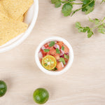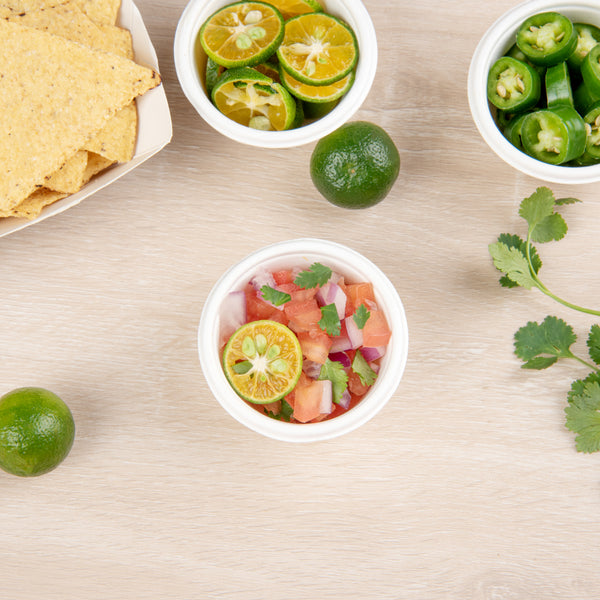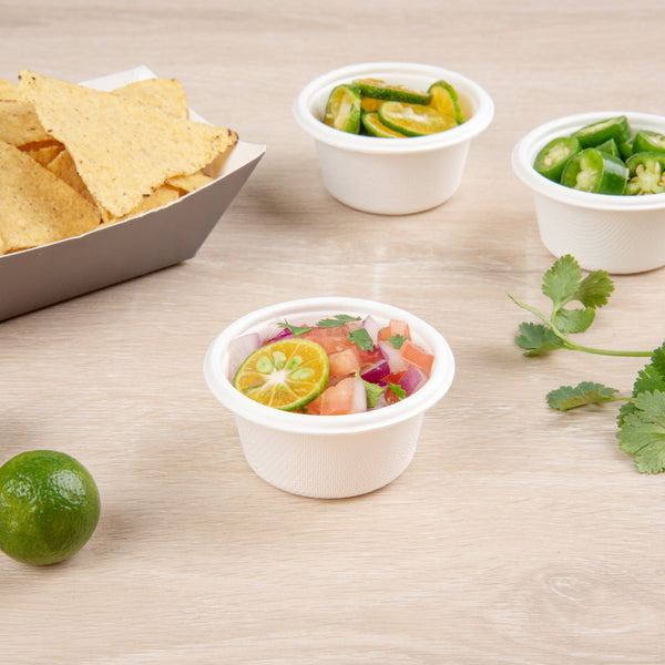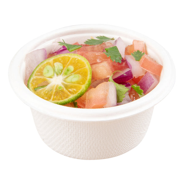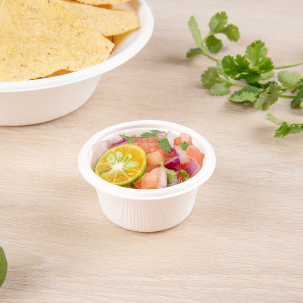 Serve hot and cold condiments alongside finger foods with our Pulp Tek 2-Ounce Round White Bagasse Take Out Portion Cups. Constructed from premium bagasse, naturally repurposed sugarcane fibers, these biodegradable portion cups are commercially compostable to minimize your establishment's carbon footprint and fit the needs of your eco-conscious patrons. These water-resistant portion cups are durable to maintain their exceptional design and prevent leaks when filled with sauces. For a quick and efficient way to heat up condiments or dips before serving, these sugarcane portion cups are microwave-safe. With a rolled rim, these 2-ounce portion cups can be securely sealed with our coordinating portion cup lids for a mess-free way to transport meals with their accompanying sauces. These single-use portion cups feature a white finish that provides the salsas or cheeses served at your foodservice establishment with a classic look. Containing up to 2 ounces, these sauce cups measure 2.5 inches in diameter by 1.25 inches in height. Sold in a 2,000 count box. This item will only degrade outside of the traditional solid waste stream. Portion cup lids (SKU: RWA0942C) are available and sold separately.