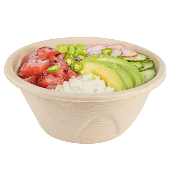 Use our Pulp Tek 36-ounce Round Natural Sugarcane / Bagasse To Go Bowls to securely pack to go orders. These bagasse bowls are crafted from natural sugarcane fibers, making them commercially compostable and biodegradable to promote a positive environmental impact. With a durable, grease-resistant design, these sugarcane bowls prevent oils from leaking through and dirtying surfaces. These sustainable bowls are strong and sturdy, making them perfect for hot or cold foods. For easy meal prep storage and reheating leftovers, these disposable bowls are freezer-safe and microwave-safe. Coordinate these bowls for hot foods with lids to lock in meals for smooth delivery. With a total measurement of 7 inches in diameter by 3.25 inches in height, these pulp bowls contain up to 36 ounces. Sold in a 100 count box. This item will only degrade outside of the traditional solid waste stream. Lids are available and sold separately (SKU: RWA1010K and RWA1011C).