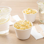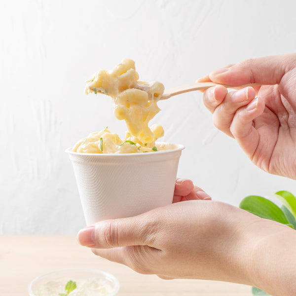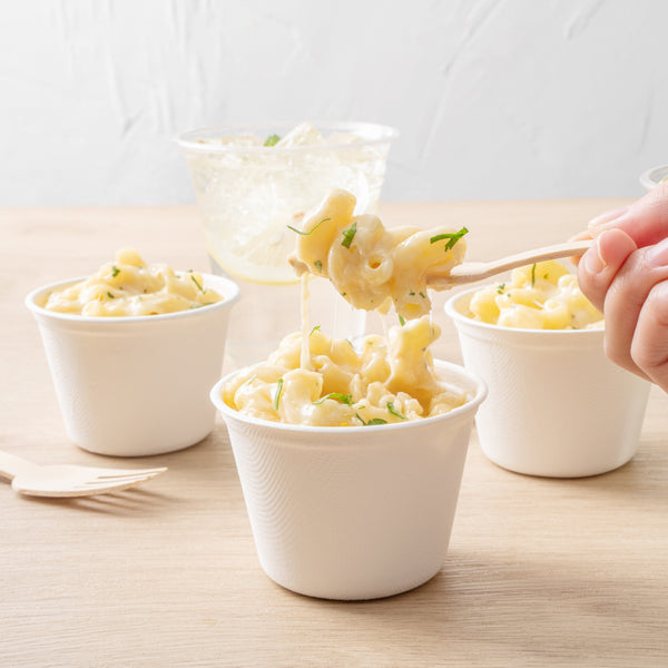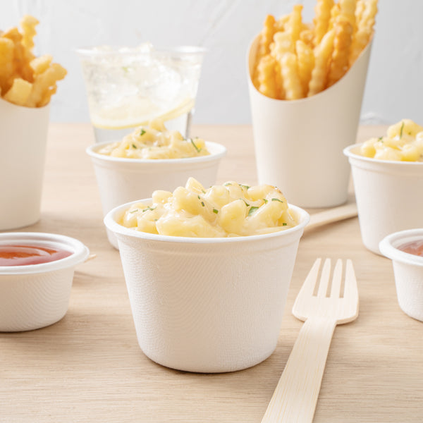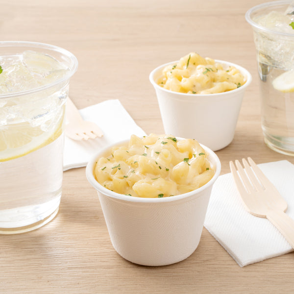 Use our Pulp Tek 5-ounce Round White Sugarcane / Bagasse Cups to sustainably serve customers. Crafted from natural sugarcane fibers, these bagasse cups are commercially compostable and biodegradable, offering a sustainable alternative to traditional cups. These disposable cups boast versatility and can be used to serve cold or hot drinks. For easy storing or reheating, these commercially compostable cups are freezer-safe and microwave-safe. Featuring a classic white finish, these biodegradable cups blend seamlessly with the theme of your restaurant or cafe for easy coordination. Designed with a reinforced rim, these sugarcane cups provide customers with a comfortable sipping experience. These sustainable cups contain up to 5 ounces and have a total measurement of 3 inches in diameter by 2 inches in height. Sold in a 100 count box. This item will only degrade outside of the traditional solid waste stream.